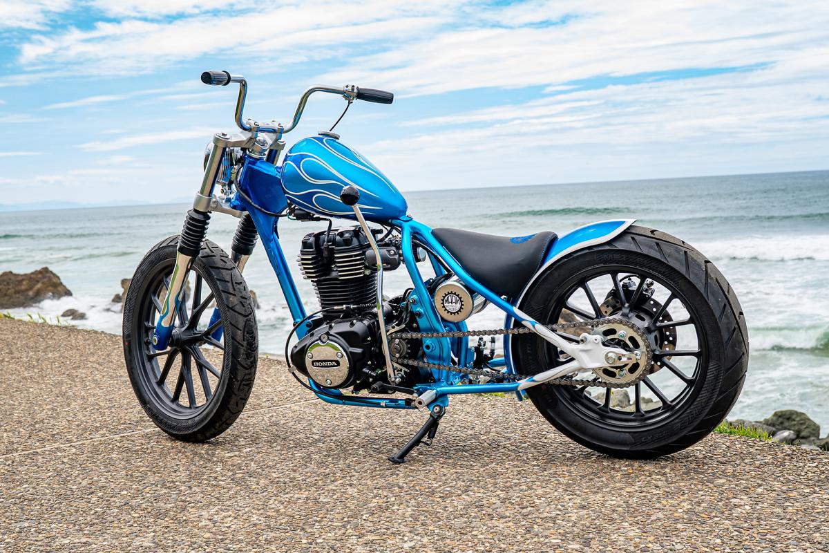 細節部分同樣令人驚艷:前端採用黃光圓燈,復古而不失叛逆感;油箱與前叉都有手工彩繪裝飾,強調工藝質感;車架以鮮明的藍色重塗,與黑色引擎、亮面鍊條形成鮮明對比;單座鞍座則以極簡形式完成,保留 Bobber 的孤傲氛圍。後輪粗壯,搭配黑色多輻鋁圈與外露鏈條,讓整車展現出極致的機械力量感。