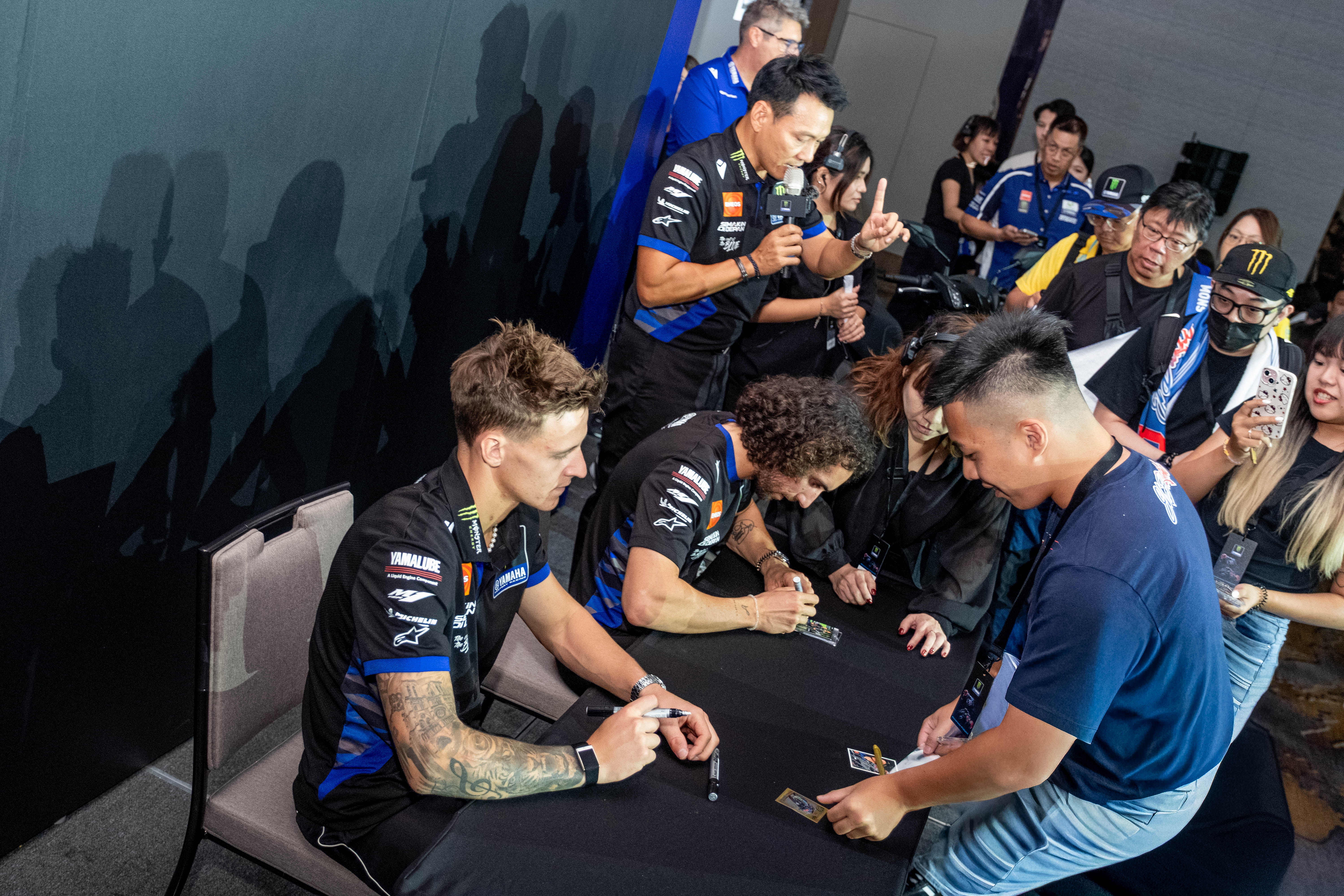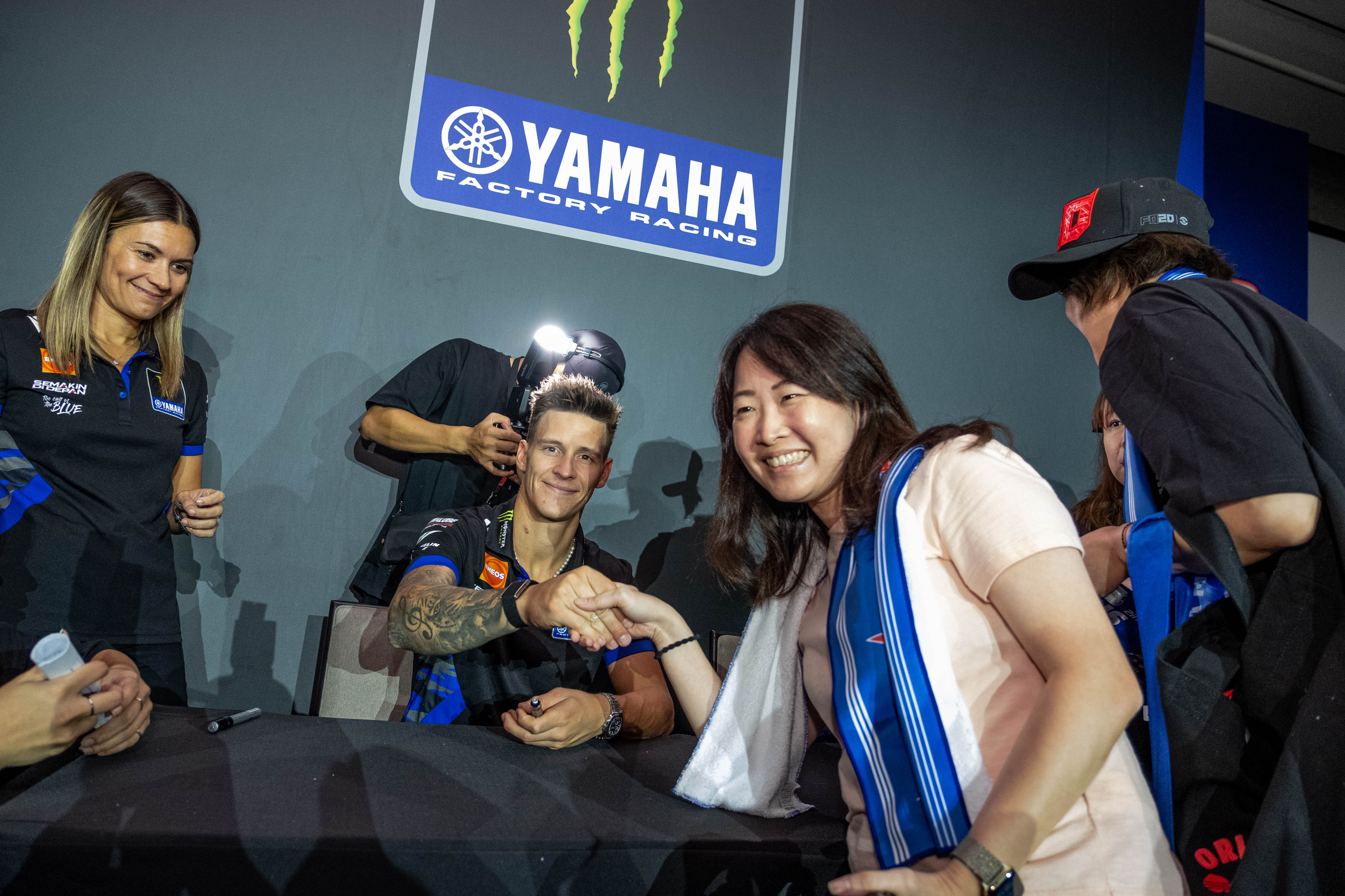 活動現場氣氛熱烈,當Quartararo與Rins在互動環節與車迷合影抽獎時,一個有趣的插曲瞬間引爆全場笑點!一位幸運車友在與Quartararo合影時,被眼尖的「小惡魔」發現手臂上疑似有另外一位GP車手的刺青,更巧的是,手機桌布也赫然是「那位車手」!