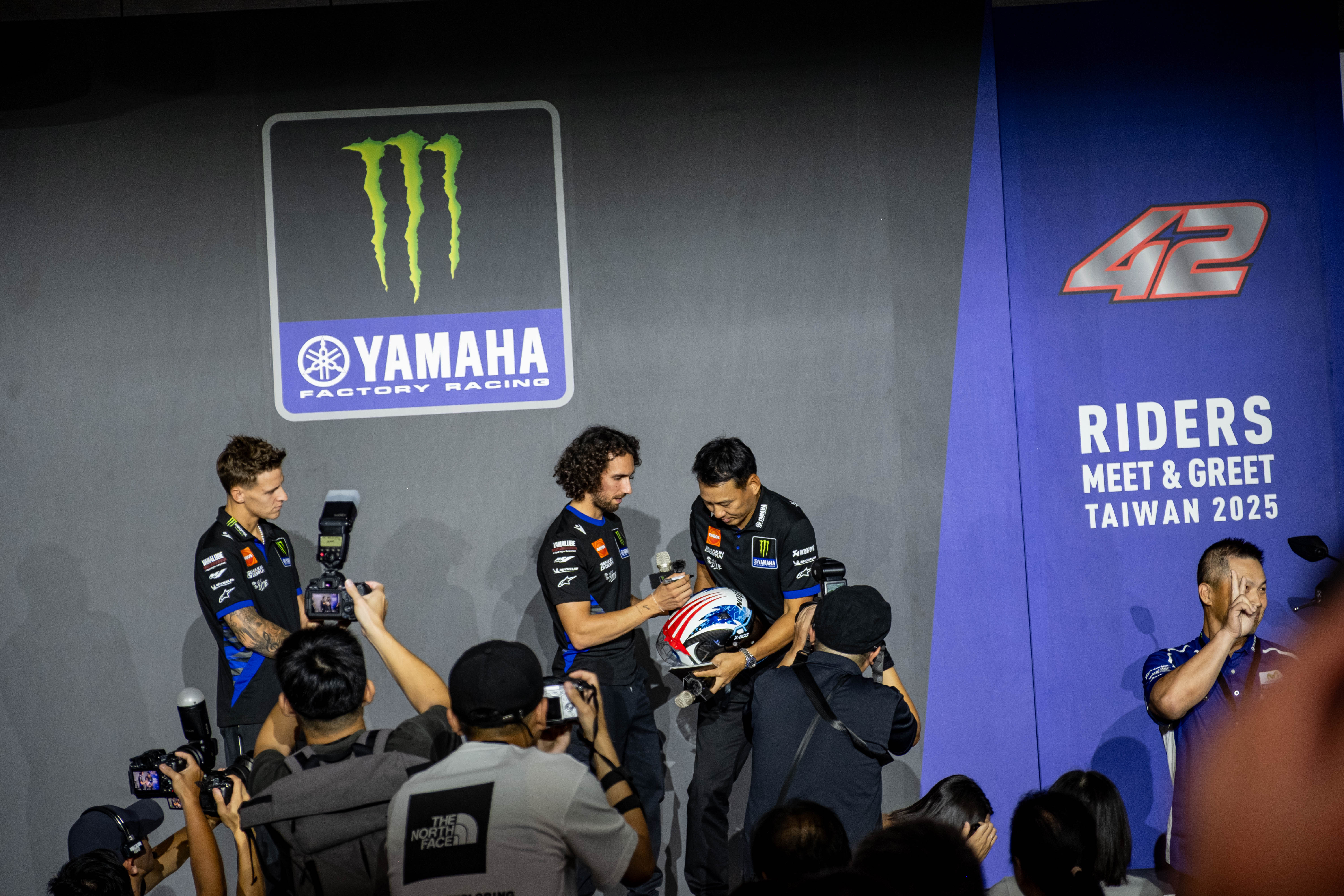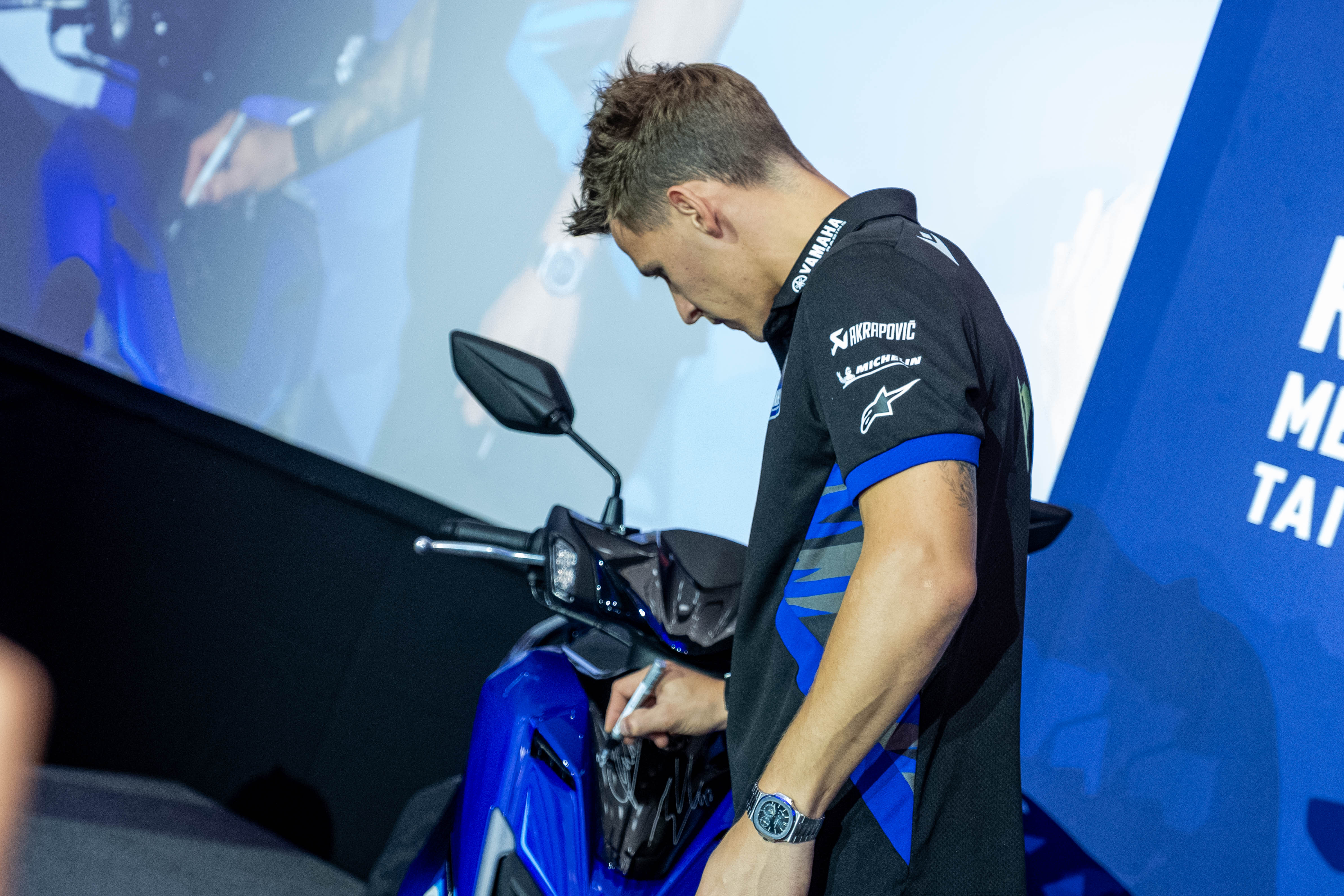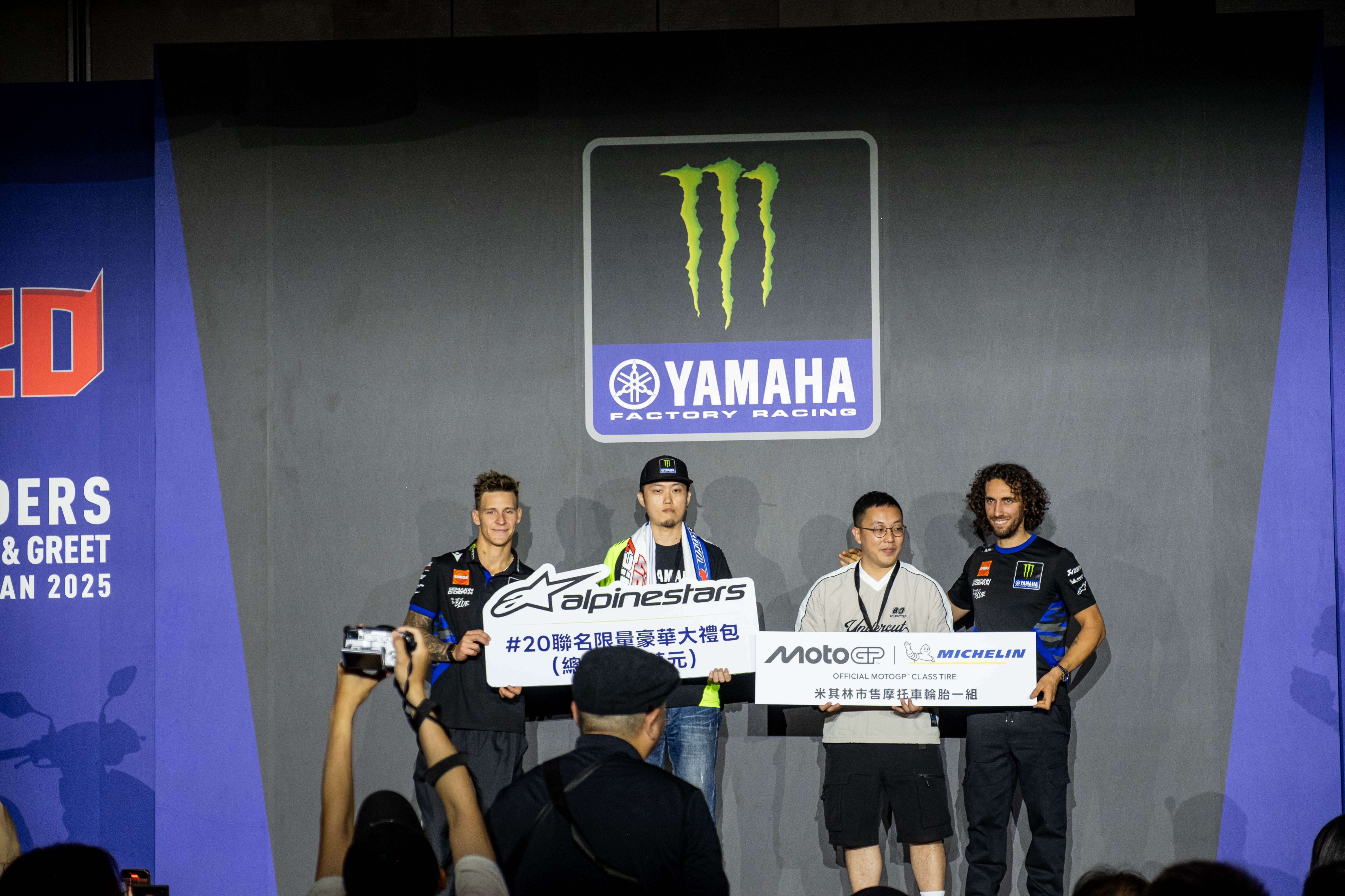 除了精彩的簽名合影與提問環節,台灣山葉機車也特別與兩大重量級品牌Alpinestars和米其林輪胎合作,由Quartararo和Rins親手抽出兩位幸運兒,送出意義非凡的豪華大禮包。能夠從偶像手中接過禮物,對車友來說絕對是畢生難忘的回憶。