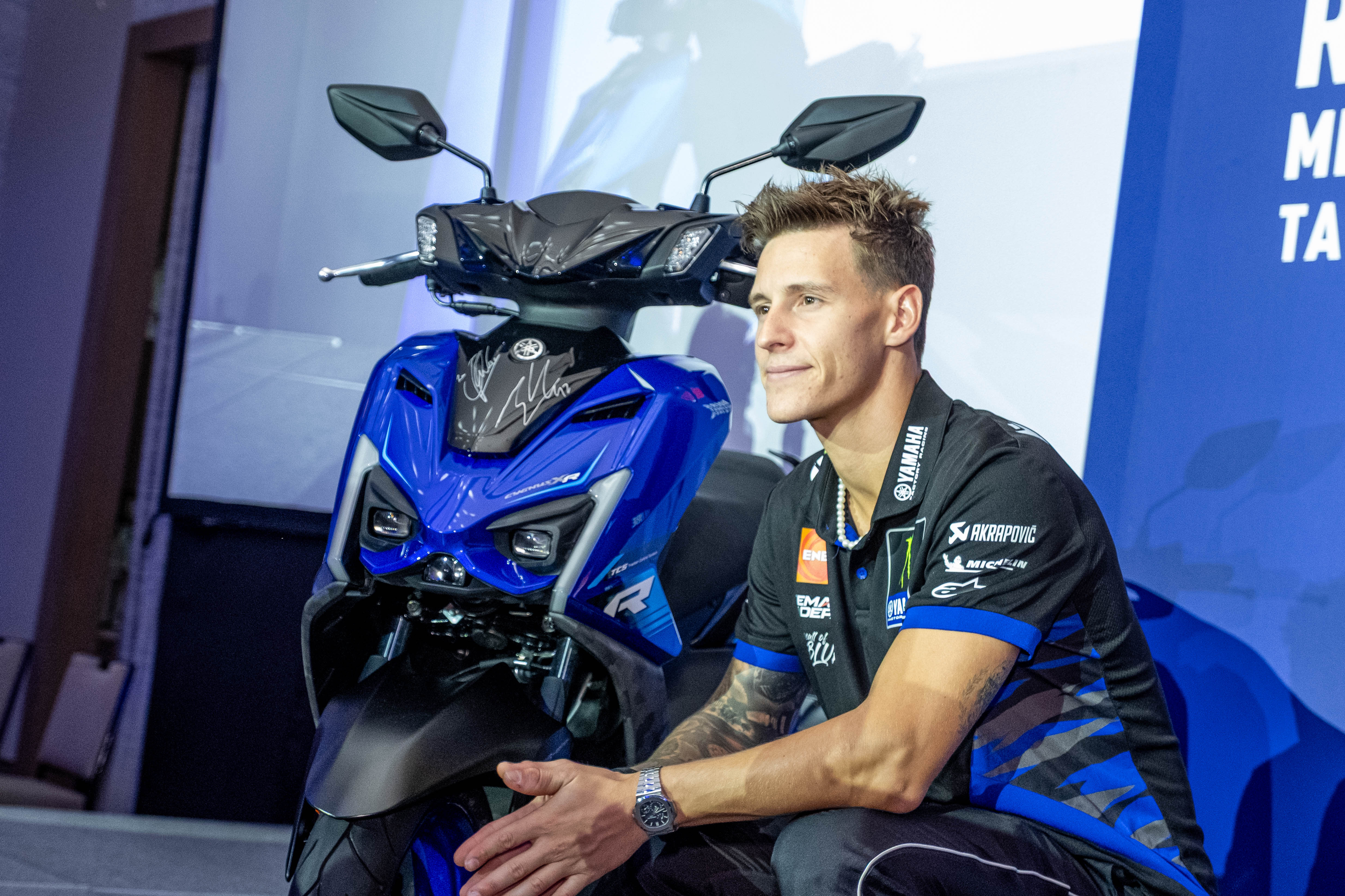 Fabio Quartararo和Alex Rins這次來台也特別參與剛上市不久的七代勁戰Cygnus X的廣告宣傳,甚至友抽空在場地內進行簡單的試乘體驗,Alex Rins表示七代勁戰的靈活性讓他印象深刻,而Fabio Quartararo則是表示整台車從動力、剎車到車架的平衡性也讓他相當喜愛,最後兩位車手也特別在現場兩台七代勁戰上簽名留念!