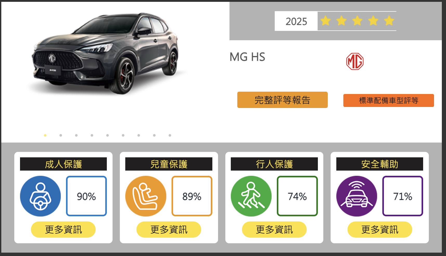 根據TNCAP所揭露的數據,Lexus RX在四大安全評等項目中表現優異,包含成人保護(94%)、兒童保護(89%)、行人保護(84%)、以及安全輔助(72%),依照星級評等的平衡標準,獲得最高的五星認證。MG HS則以成人保護90%、兒童保護89%、行人保護74%及安全輔助71%的成績,亦獲得五星評價,展現中國品牌在安全領域的積極進步。