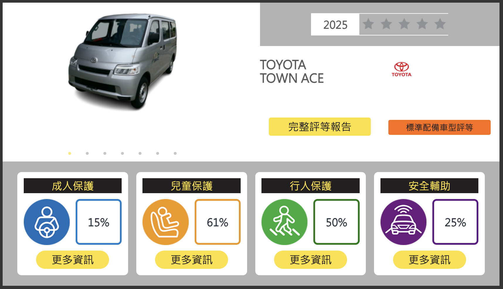 與前兩者形成強烈對比的是Toyota Town Ace,該車款在成人保護僅獲得15%,安全輔助僅25%,即使兒童保護(61%)與行人保護(50%)相對稍佳,整體仍無法達到平衡評等標準,因此被評為零顆星,成為TNCAP推動以來罕見的最低評等車型。