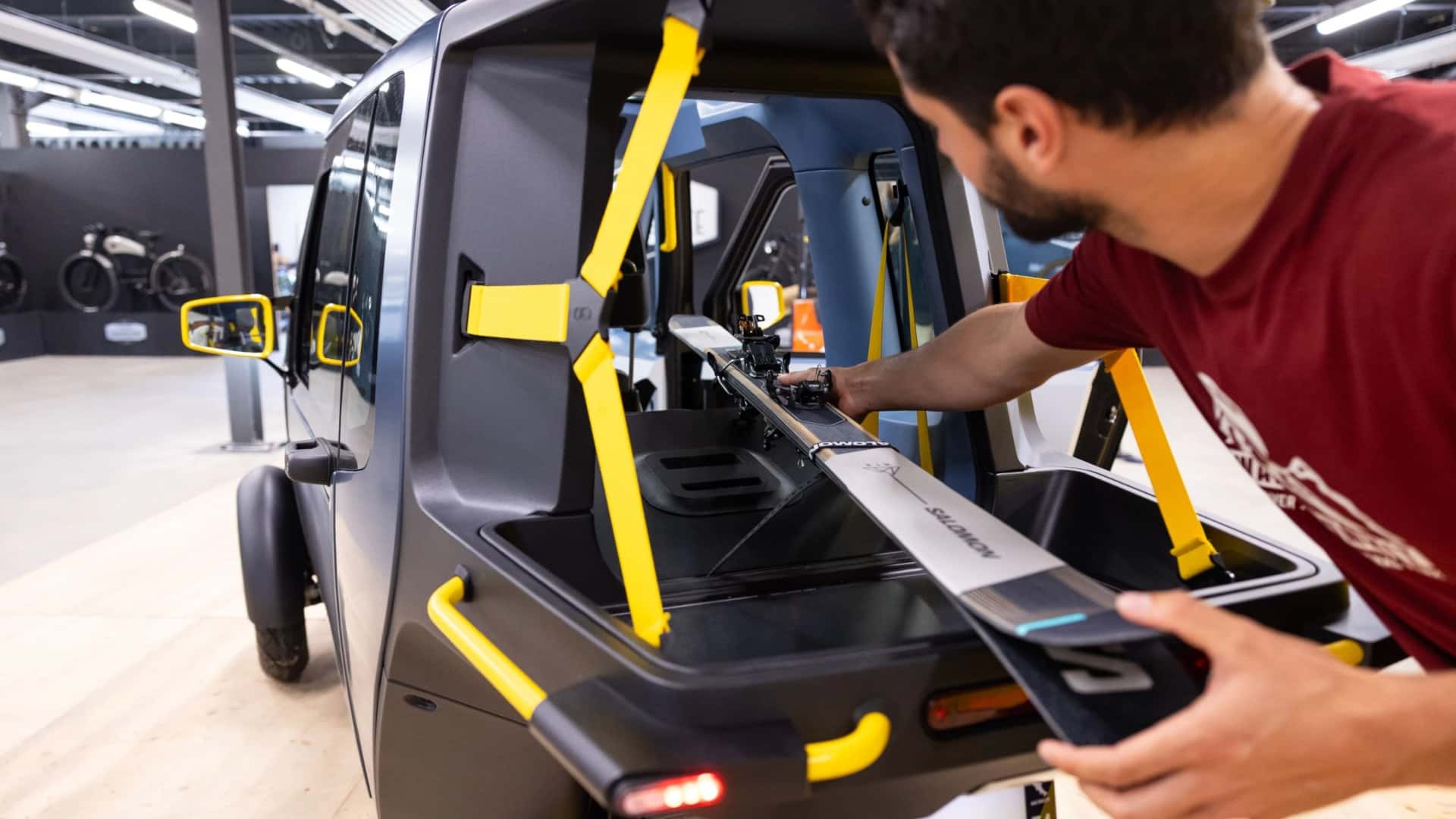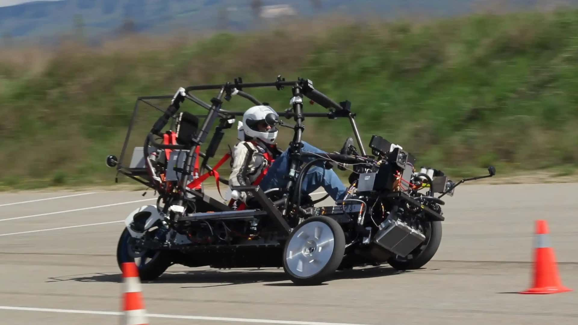 駕駛者以低姿仰躺方式乘坐,頭部高度僅約 130 公分。透明艙罩包覆全車,內部具備空調、三點式安全帶與吸能式車架,左右控制桿操控方向,還能主動傾斜入彎。後方可放行李或載一名乘客,甚至是你的狗。