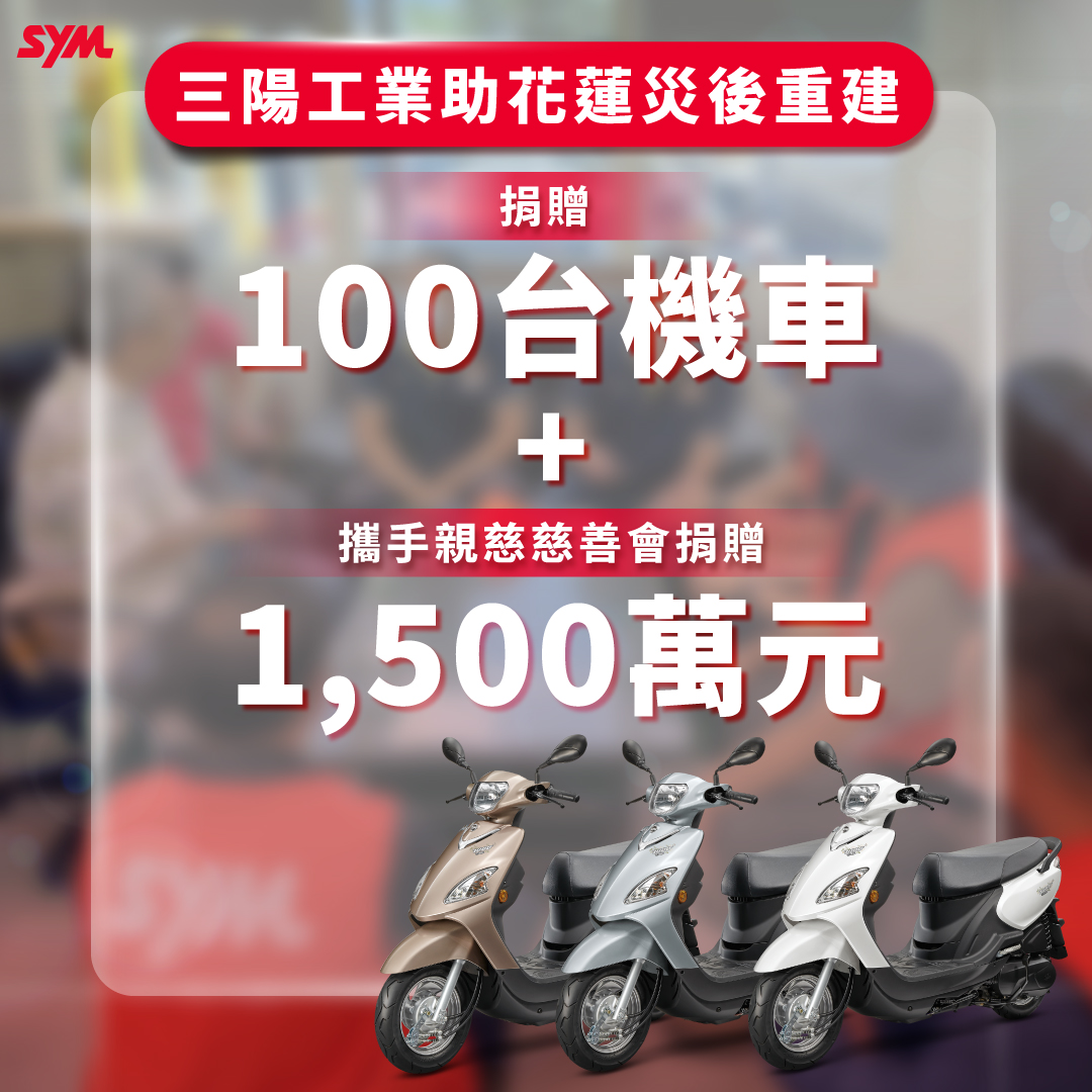 針對近期花蓮因堰塞湖溢流所造成的嚴重災情,三陽工業股份有限公司(SYM)秉持企業社會責任精神,響應行政院東部聯合服務中心號召, 捐贈100台機車與1000萬善款,加計公益團體「社團法人親慈慈善會」提撥之500萬,共計百台機車與新臺幣1,500萬元,協助災區重建,支援受災民眾早日恢復正常生活。