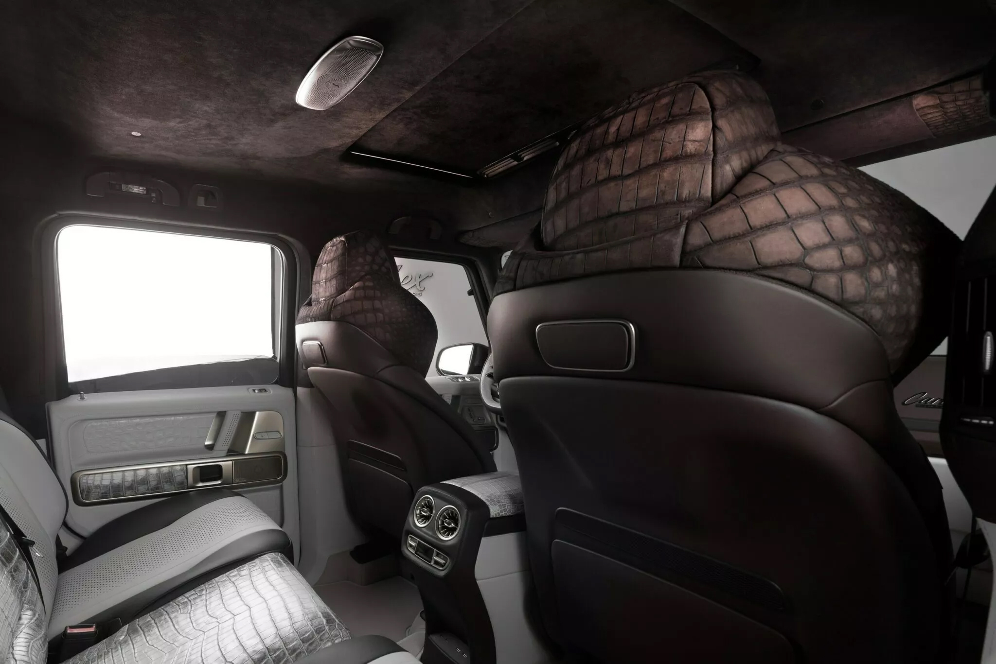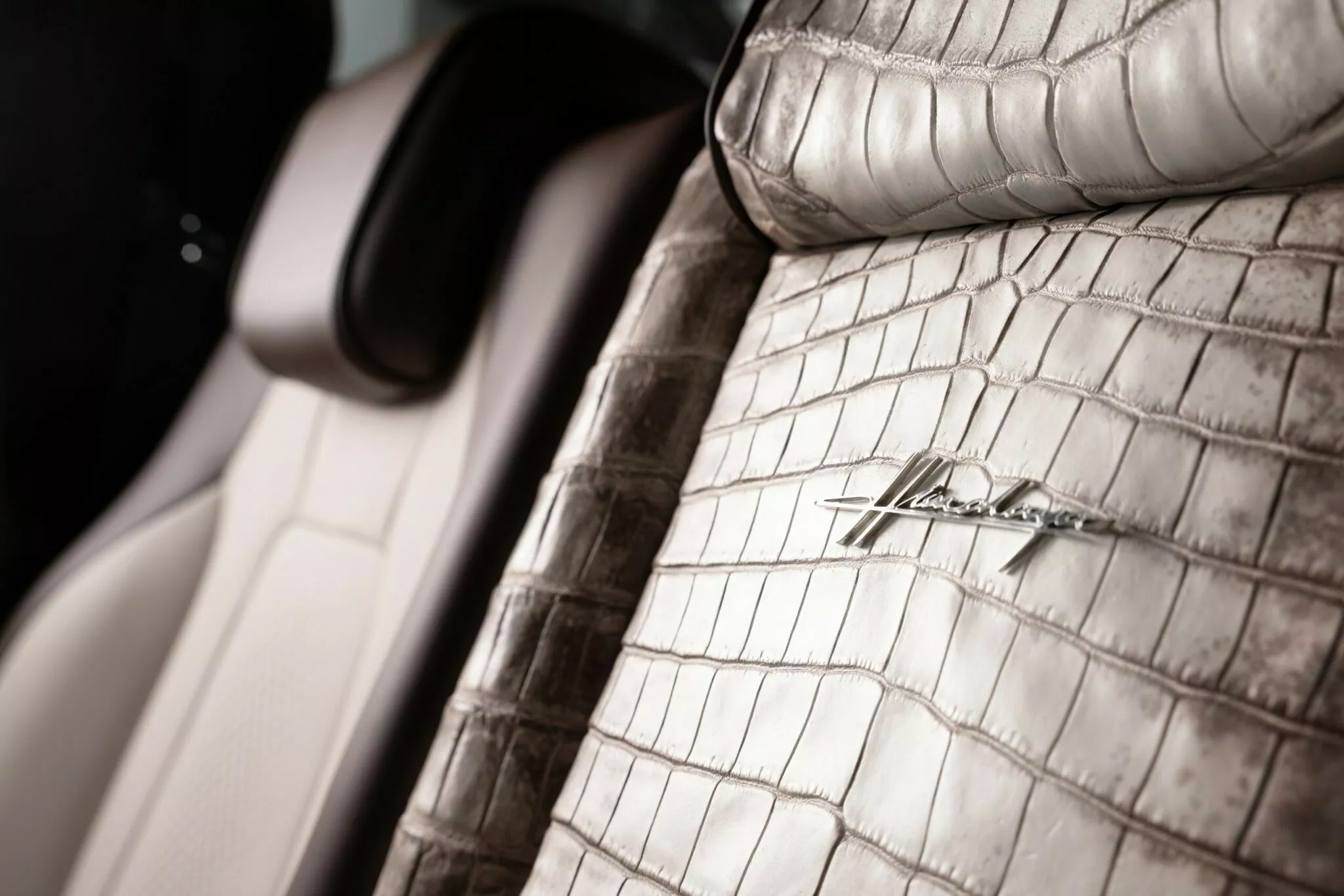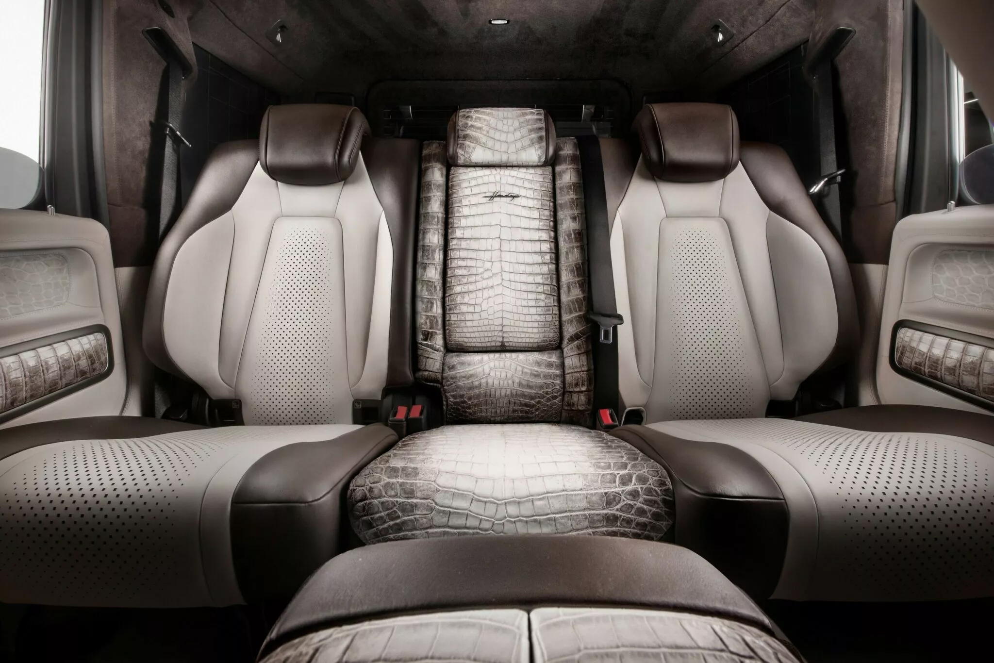 進入車艙,Carlex將重心放在內裝的極致工藝。座椅包覆著名為 Himalaya Leather 的鱷魚皮革,這種皮料正是Hermès Birkin包的傳奇材質。中央後座與前座皆採用此頂級皮革,其餘區域則以白色與棕色皮革搭配Alcantara麂皮頂篷,營造出華麗又溫潤的氛圍。