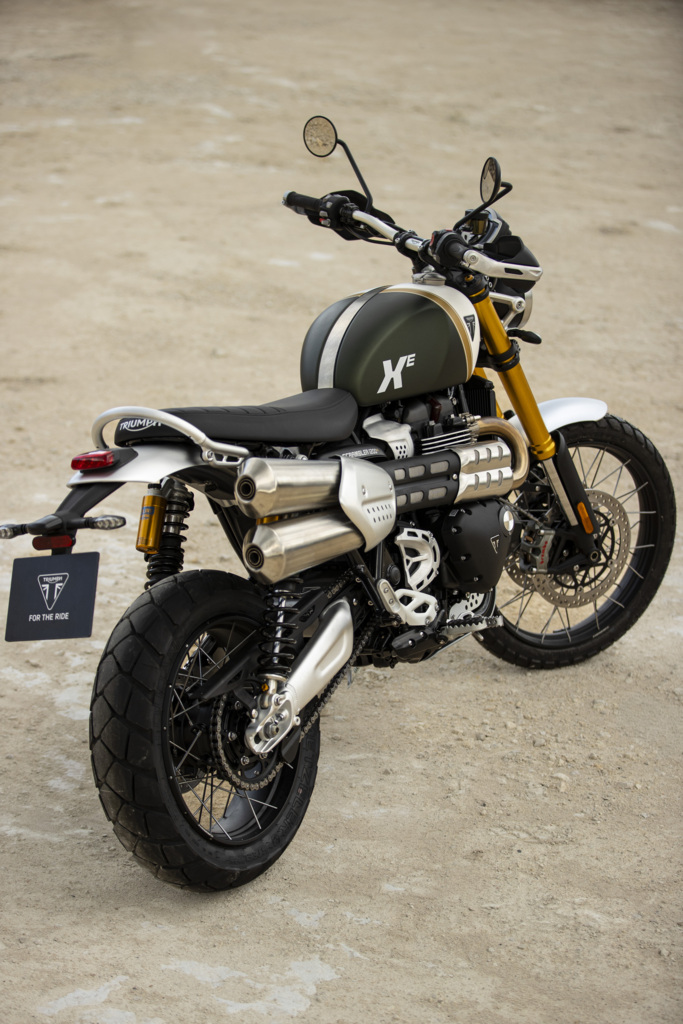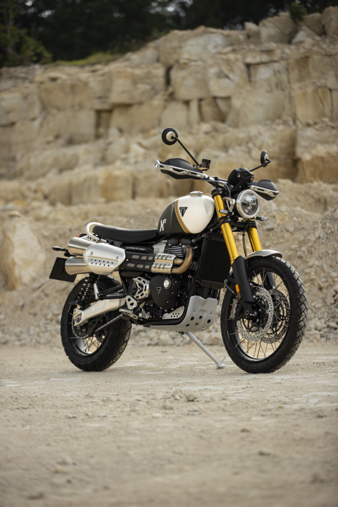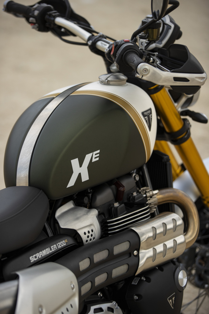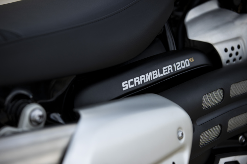 Scrambler 1200 XE 的輪廓依舊強烈而經典:高聳的 21 吋前輪、雕塑感油箱、條紋座墊與高位排氣,構築出 Triumph 專屬的英倫粗獷氣質。
