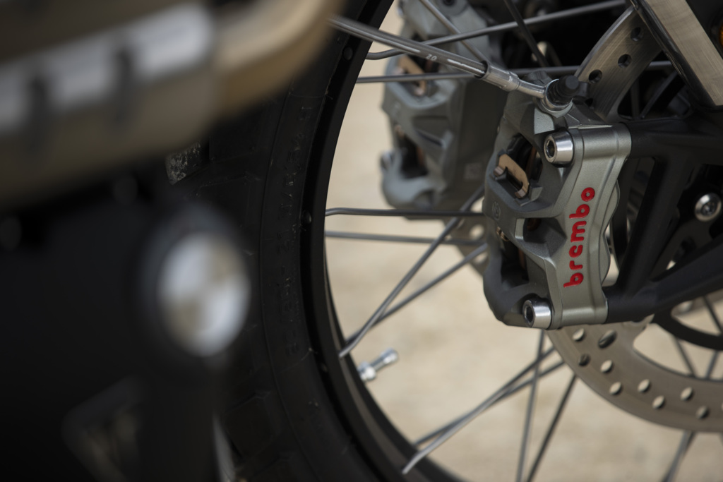 煞車系統採用 Brembo Stylema M4.30 輻射卡鉗 搭配 320mm 雙碟盤,提供同級最強制動力;後輪則為 Nissin 卡鉗配 255mm 碟盤,並搭載 傾角感知式 Cornering ABS 與循跡控制系統,在各種地形下皆能自信掌控,也能完全關閉輔助,釋放原始越野快感。