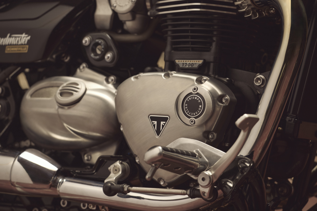 Speedmaster 採用 1200c.c. 水冷 Bonneville 並列雙缸引擎,以「High Torque」設定輸出最厚實的中低轉扭力。最大馬力 78PS、峰值扭力 106Nm 在約 4,000rpm 時全數釋放,油門輕扭即有飽滿推力。270 度曲軸角 讓節奏更自然、有呼吸感,搭配雙出斜切排氣管,釋放出深沉厚實的 Bonneville 聲浪——那是一種不疾不徐的力量感。引擎同樣符合 EURO 5+ 排放標準,節能又環保。