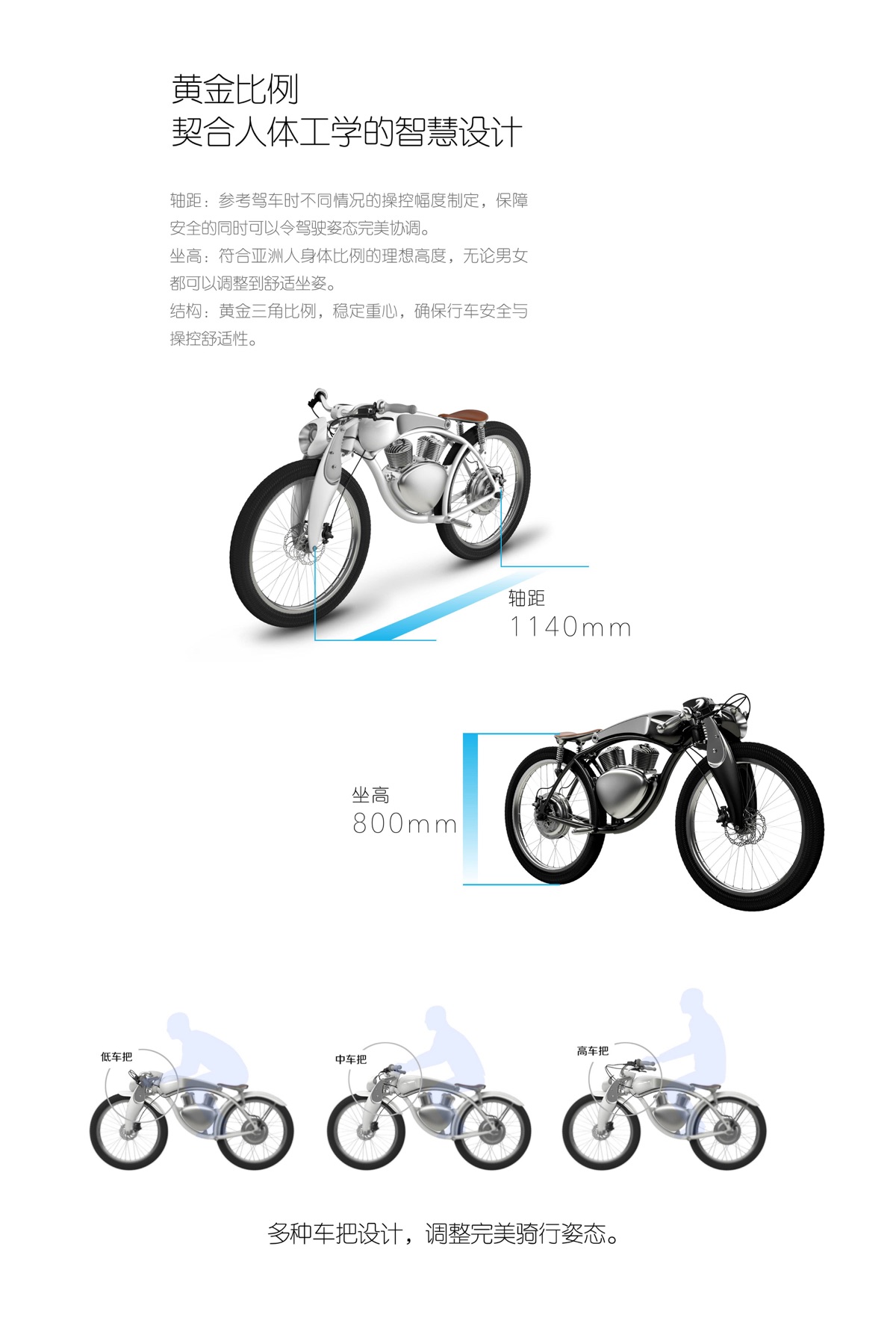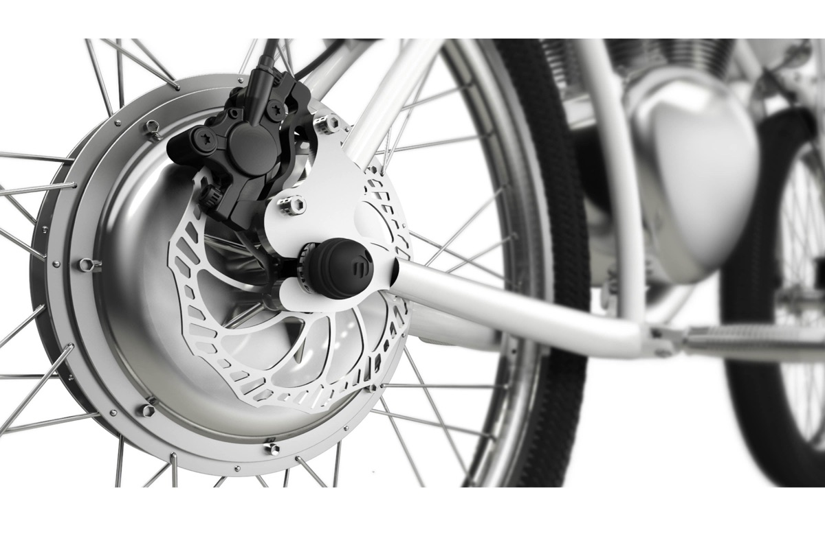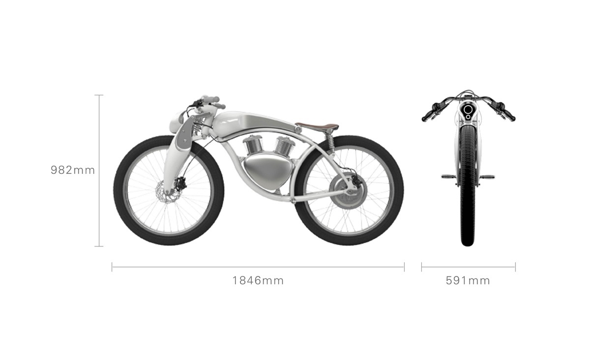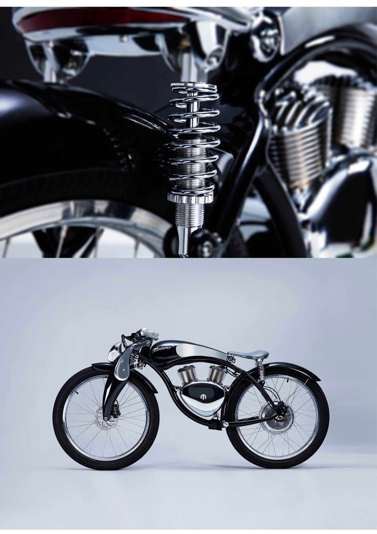 外觀採用了特殊的烤漆工程,可以耐磨、耐腐蝕、耐紫外線,讓這輛車的質感提升到另一個水準,而引擎部分的V型雙缸裝飾也令人著迷,雖然有些突兀但復古的感覺油然而生,煞車採用了前後雙碟的配置,共4碟煞、8液壓的系統讓制動力有一定的水準,但從這小小的碟盤就可以看出這比較像是一輛腳踏車才對,不過前鋁合金的搖臂設定不僅看起來有些特別,更能有效吸收路面震動,更加穩定且安全。