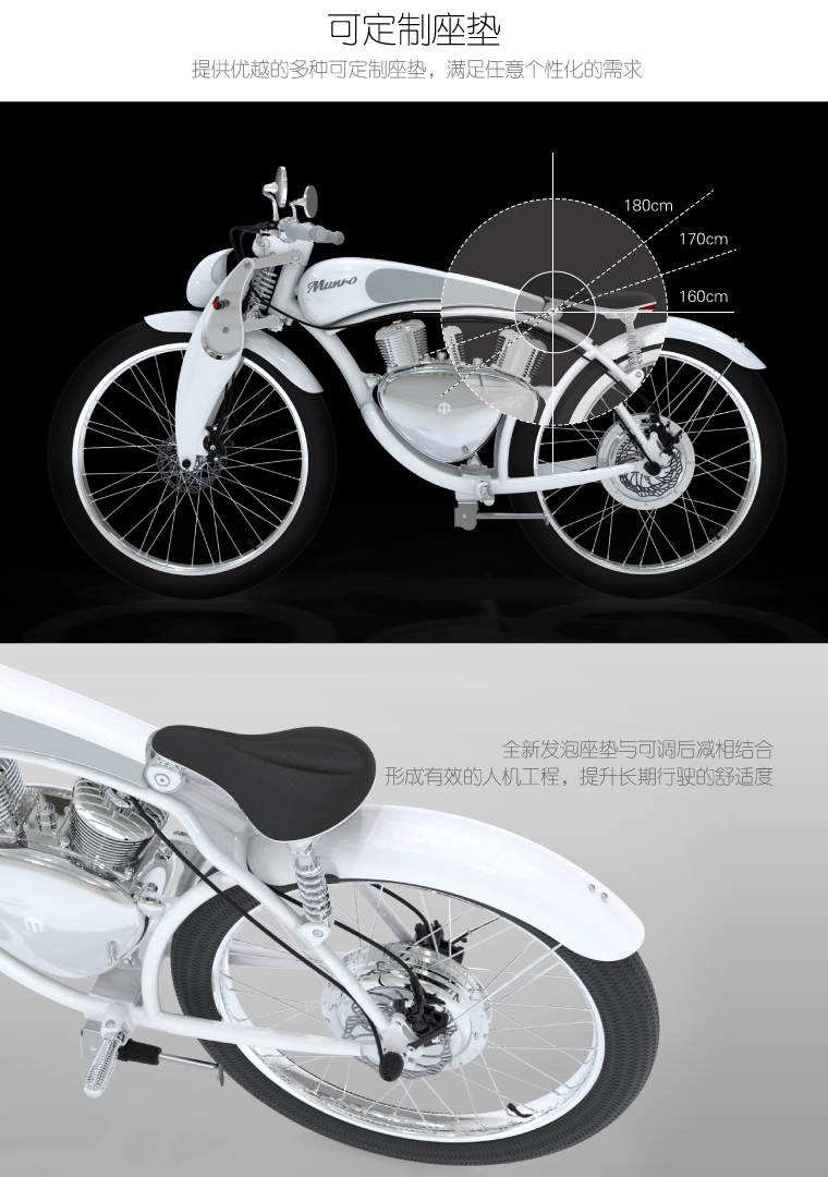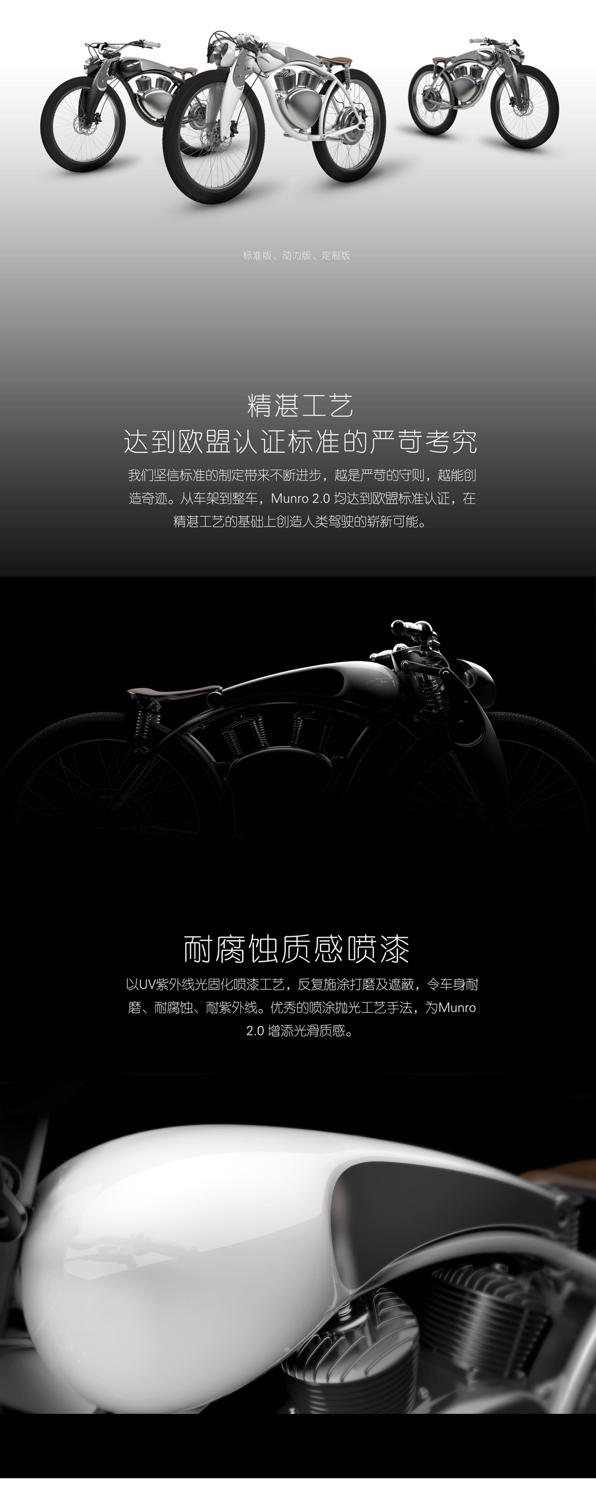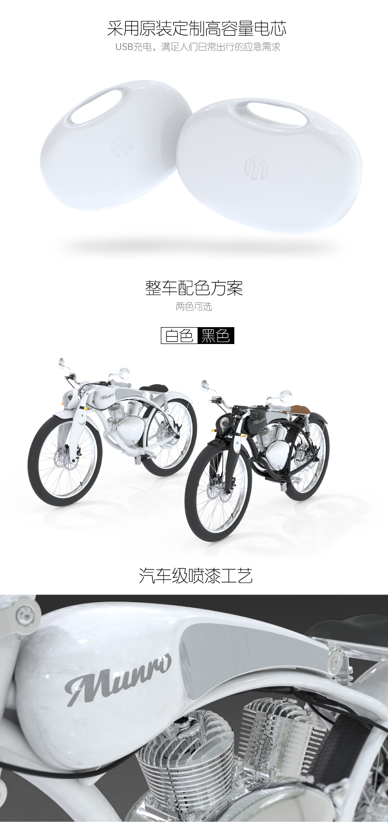 取名字Munro自然是為了向在1967年時,Burt Murno騎著Indian的機車突破了1000c.c.以下的最速記錄而致敬,其設計風格自然也就傾向了80年代的語彙,但在電動機車的結構下卻可以設計的更加簡潔,而且造型上也更為獨特,雖然仔細一看是有些電動腳踏車的感覺,但不得不說就算是台腳踏車也夠令人著迷的了。