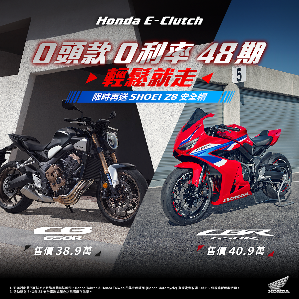 本月特別推出 「風格隨行 任性開騎」專案,Rebel車系低座高與流暢的動力輸出,深受展現自我個性的車主喜愛,11月訂購Rebel500、Rebel 1100,即贈送原廠左右馬鞍包套組,兼顧造型與實用性,讓旅途收納更輕鬆,完美融合率性風格與裝載便利性。搭載科技新潮流的CB650R E-Clutch以及CBR650R E-Clutch,以簡易、直覺的操作體驗,獲得市場熱烈迴響,享48期0頭款 0利率優惠,限時再送Shoei Z-8安全帽,讓騎士在享受騎乘樂趣的同時,也能兼顧行車安全與時尚風格。同時針對多款人氣機種提供超值的「通通零利率 追風零阻力」專案,全車系指定車款最高享72期、0頭款、0利率,不論是日常通勤、假日出遊或冒險壯遊,都能無壓力且無負擔入主Honda人氣二輪機種,享受專屬於騎士的馳騁自由。