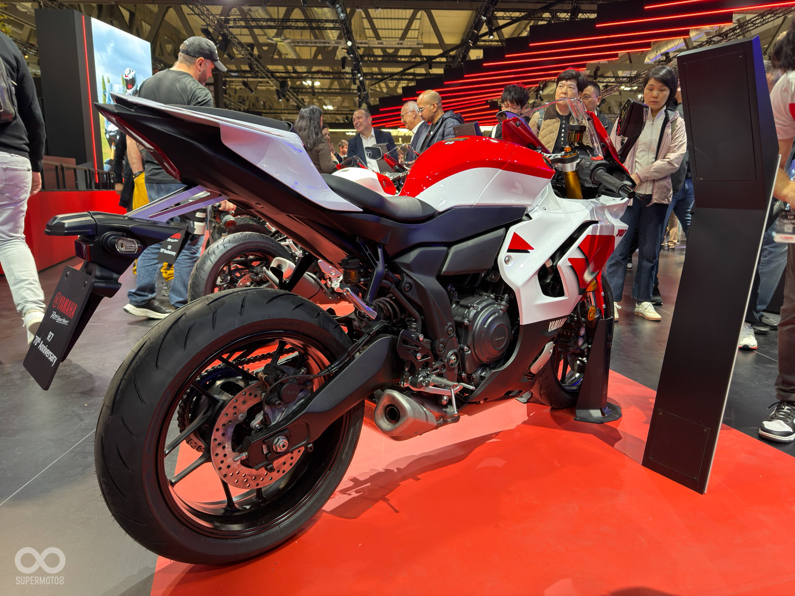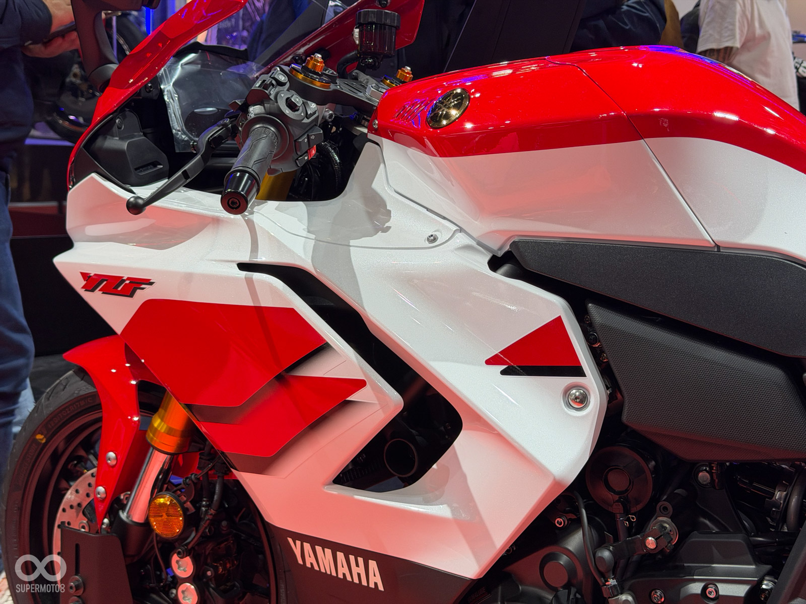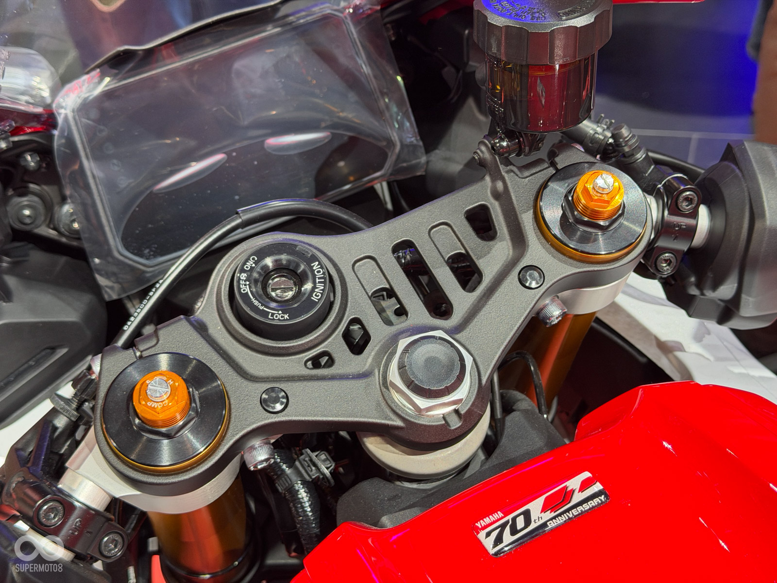 Yamaha 幾乎把車架每一段鋼管都重新盤點:佈局、直徑、厚度到補強,全為提升扭轉/縱向/橫向剛性而來,但重量維持不變。中央支架改鋼板、搖臂重新設計,路感回饋更清楚;三角台去掉多餘肉,手感與視覺更接近 R1 / R9 。41mm 倒叉改上鋁製活塞桿,直接瘦 350g ,再配上可全可調阻尼;首次換上 SpinForged 輪圈與 S23 運動胎,轉向更輕、更乾脆,車身抑制俯仰也更安穩。
