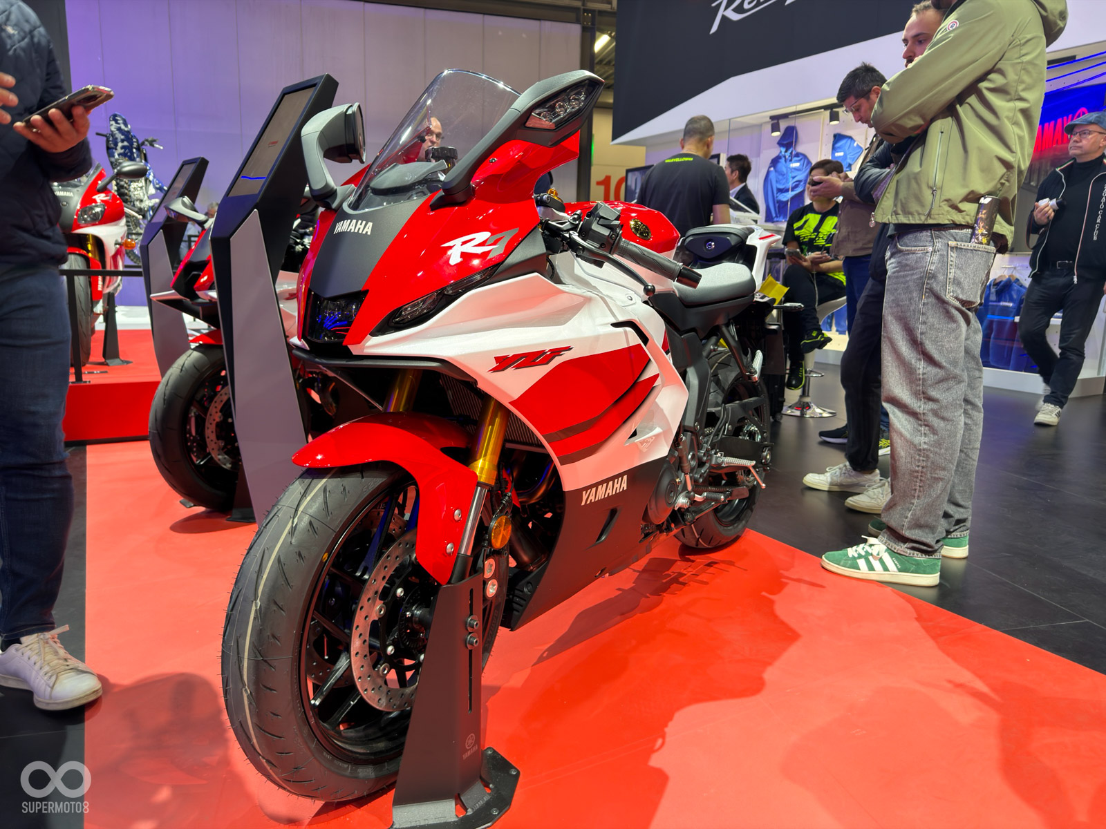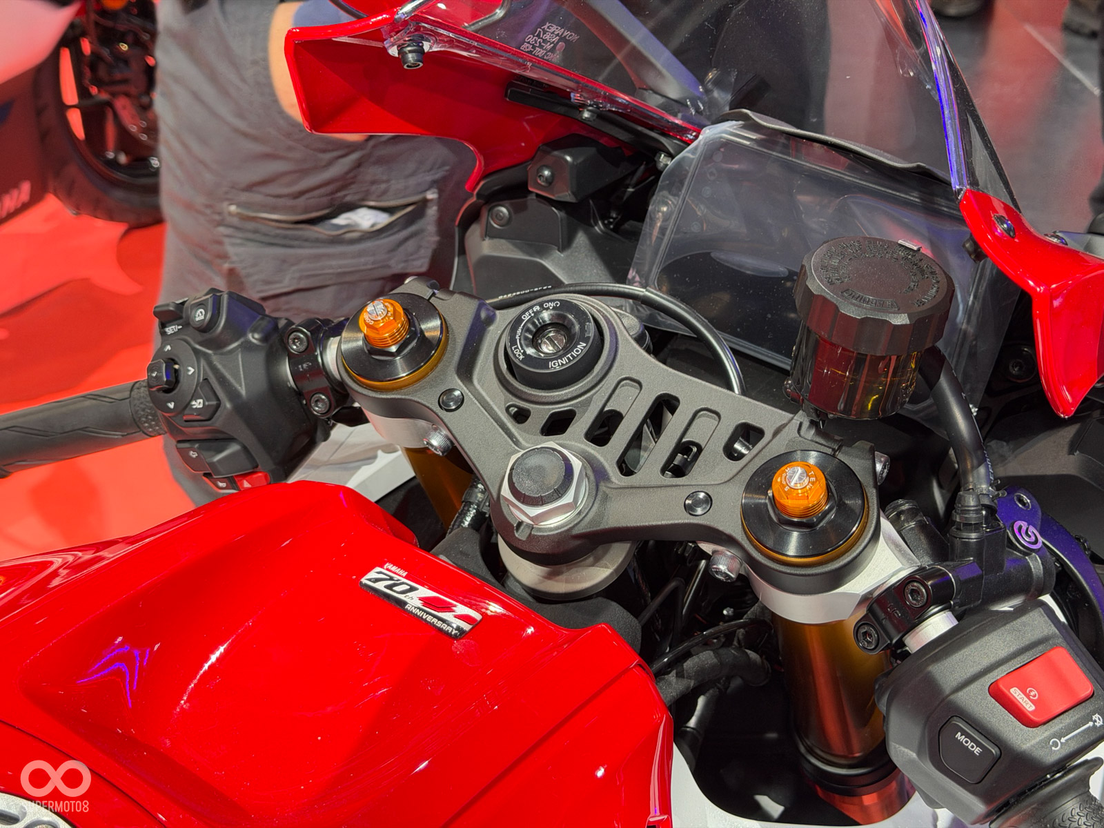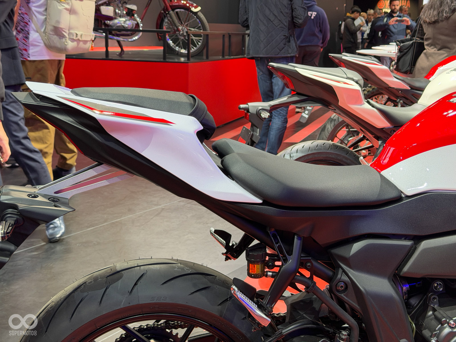 Yamaha 幾乎把車架每一段鋼管都重新盤點:佈局、直徑、厚度到補強,全為提升扭轉/縱向/橫向剛性而來,但重量維持不變。中央支架改鋼板、搖臂重新設計,路感回饋更清楚;三角台去掉多餘肉,手感與視覺更接近 R1 / R9 。41mm 倒叉改上鋁製活塞桿,直接瘦 350g ,再配上可全可調阻尼;首次換上 SpinForged 輪圈與 S23 運動胎,轉向更輕、更乾脆,車身抑制俯仰也更安穩。
