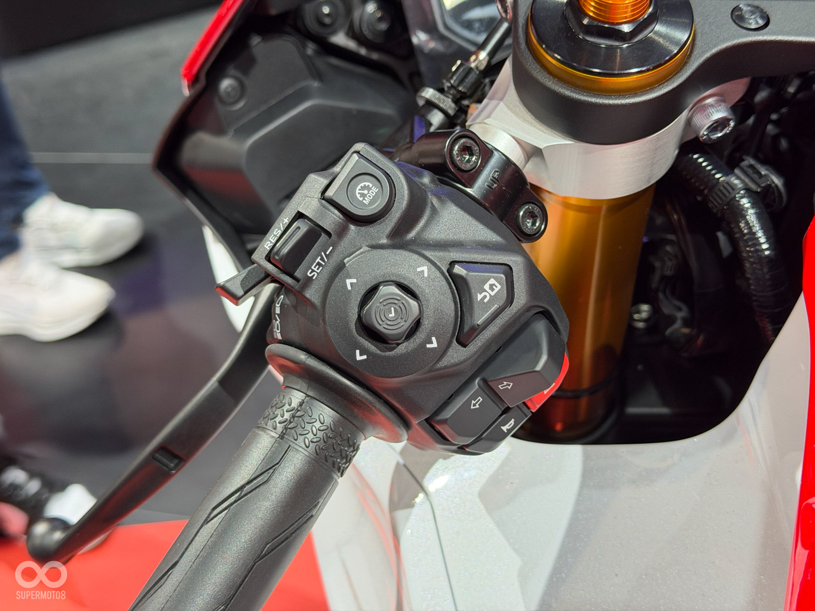 5 吋全彩 TFT 帶四種道路佈景,專屬 Track Mode 只留單圈等關鍵資訊;全新的把手整合開關,把導航、連線、模式切換與選單都收進同一套介面。方向燈有自動回復與三閃功能, ESS 急煞會亮雙黃。定速巡航與限速器照顧長途。
