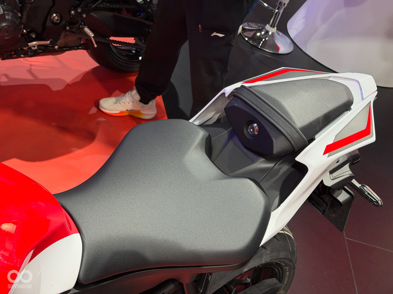 把手位置與油箱造型調整後,上半身活動空間更大、更容易前後移重;座高從 835 降到 830mm ,親和力更好。坐墊線條銳利、抓附感更佳,腳踏直接沿用 R1 ,過彎時下半身更穩。