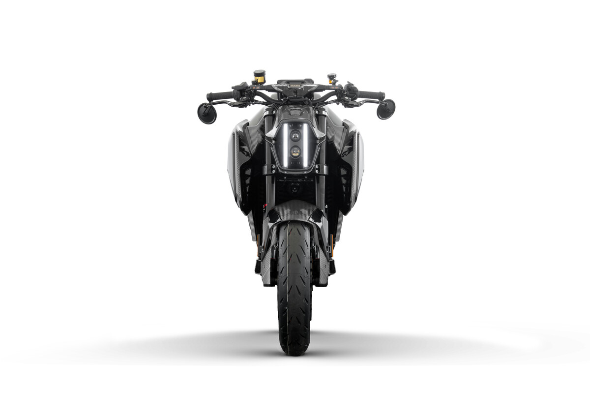外觀延續「Black and Bold」設計理念,採用 WIDESTAR 寬體空力外觀 與高精度碳纖維部件,全車以專屬 Midnight Veil 深色塗裝呈現。LED 頭燈整合品牌標誌性日行燈條,前土除、油箱整流罩與下導流板皆以碳纖維貫穿設計,營造出極具張力的機械美學。