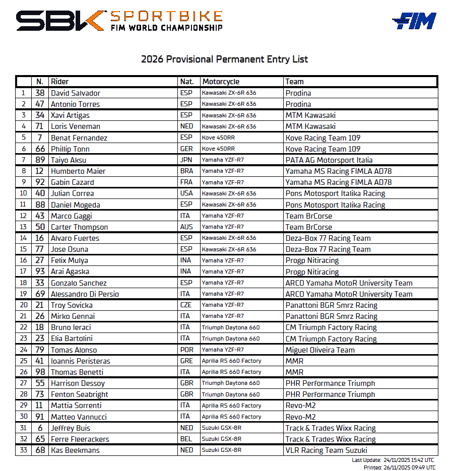 賽程部分,2026 WorldSPB原則上會跟隨WorldSBK的腳步,但場次集中在歐洲賽道。賽季預計將於3月底在葡萄牙的Portimao賽道揭開序幕,緊接著4月中旬來到荷蘭Assen,5月初則是前往匈牙利的Balaton Park。隨後的5月至6月將密集進行捷克Most、西班牙Aragon以及義大利Misano等站點。
