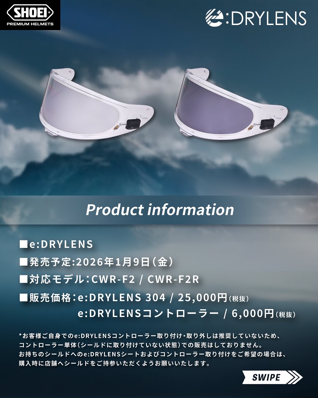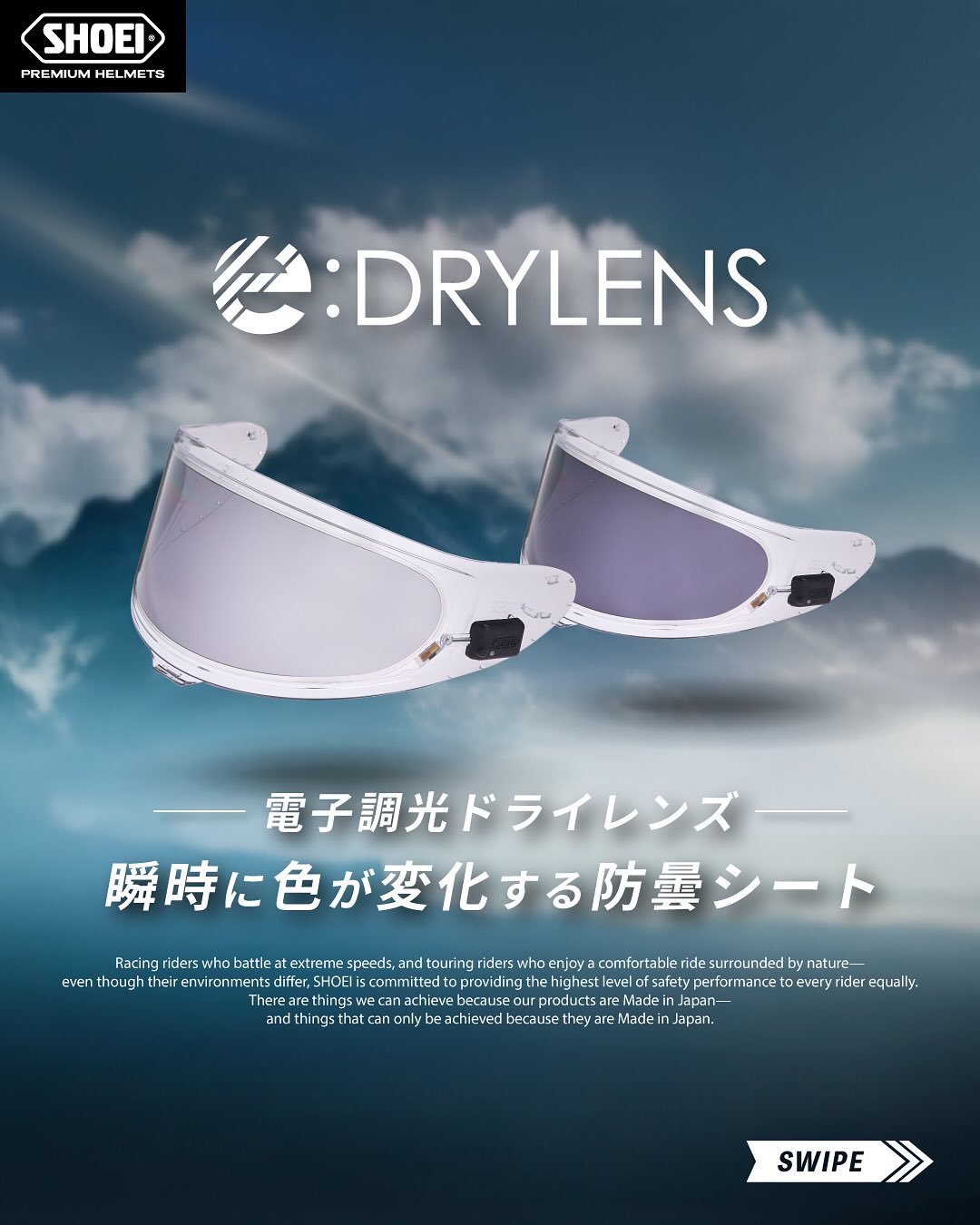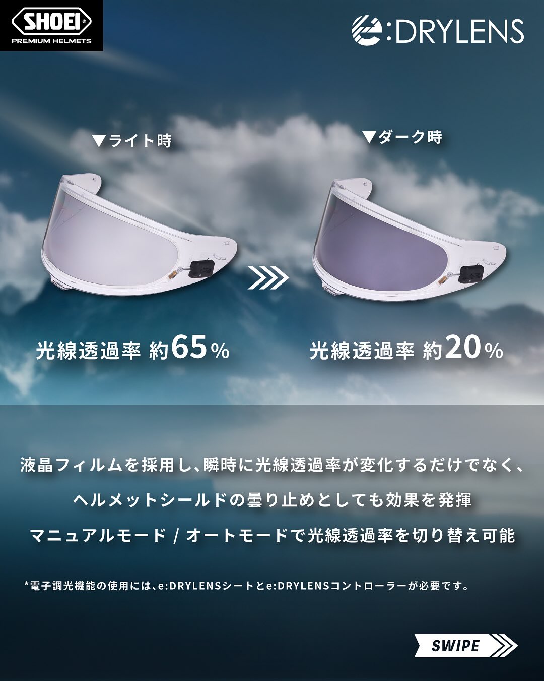 不同於傳統依賴紫外線變色的鏡片,SHOEI e:DRYLENS 採用了先進的 「液晶薄膜(Liquid Crystal Film)」 技術。這項科技最大的優勢在於「瞬時反應」,騎士可以透過專用的控制器,在毫秒之間切換鏡片的透光度,徹底解決了進出隧道時「瞬間致盲」的安全隱患。
