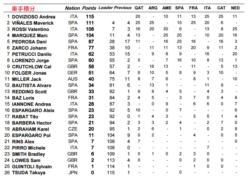 第11位出發的Vinales 於比賽中途一度衝上第五名,卻在第12圈的小彎摔車離場,這是他本季第二次未完賽,此舉讓他失去了積分第一的寶座,但仍與第一名的Dovizioso 保持四分差距。