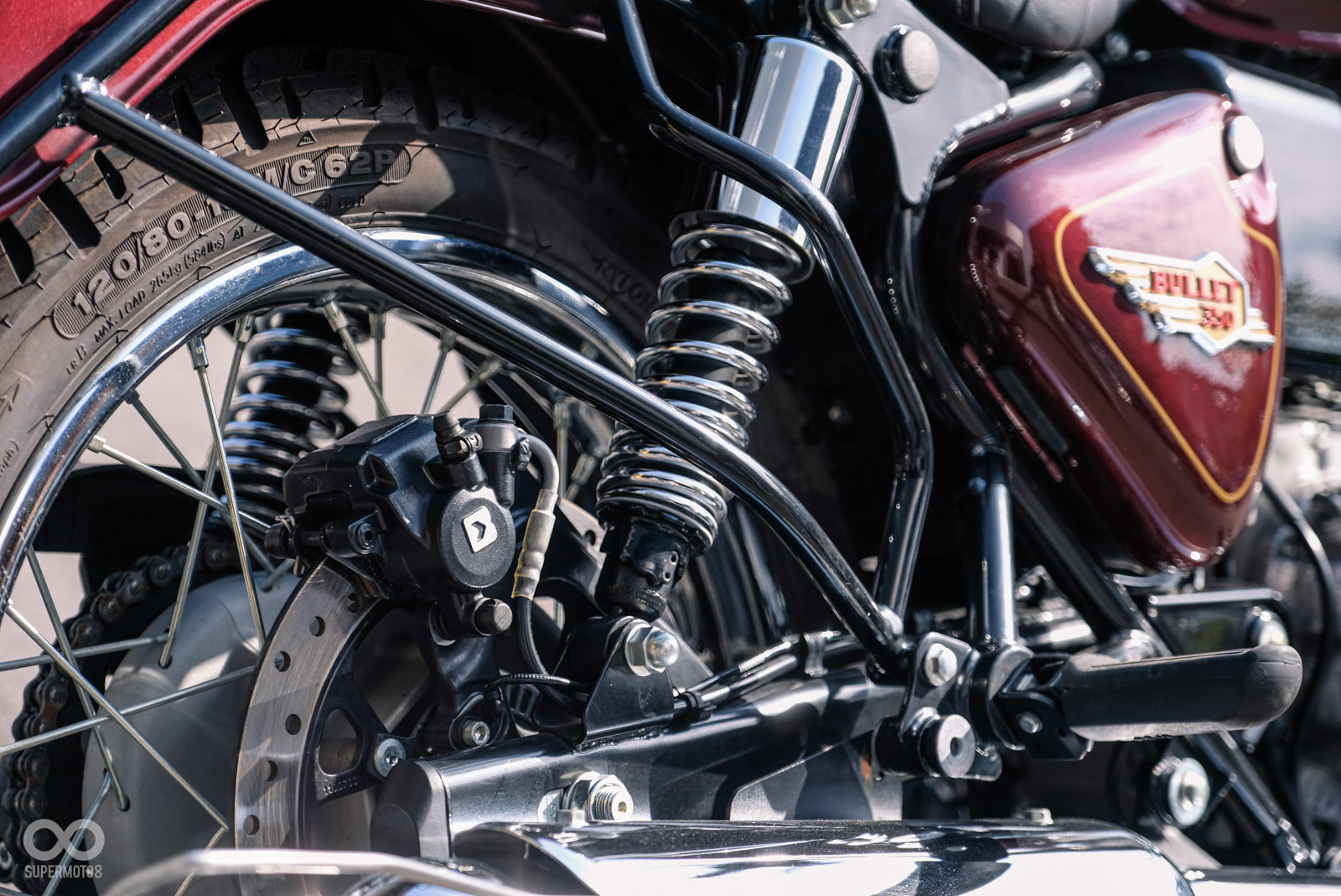 在規格方面,Bullet 350 搭載了 349cc 單缸長衝程引擎,這具引擎在 6,100 轉時可輸出 20.2 匹馬力,而 27 牛頓米的最大扭力在 4,000 轉時就能全數爆發,低轉高扭的特性非常適合在城市間穿梭;懸吊系統採用 130mm 行程的伸縮式前叉與 80mm 行程的後雙槍避震器;煞車配備前 300mm、後 279mm 碟煞並搭配雙通道 ABS 系統,確保了復古之餘的安全性 。