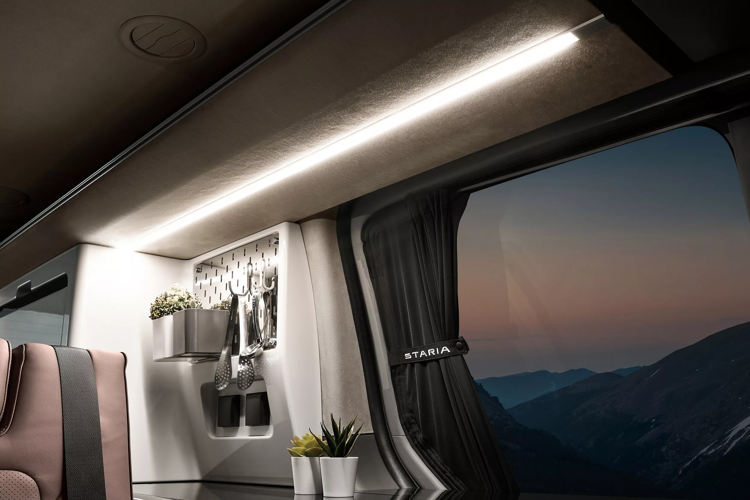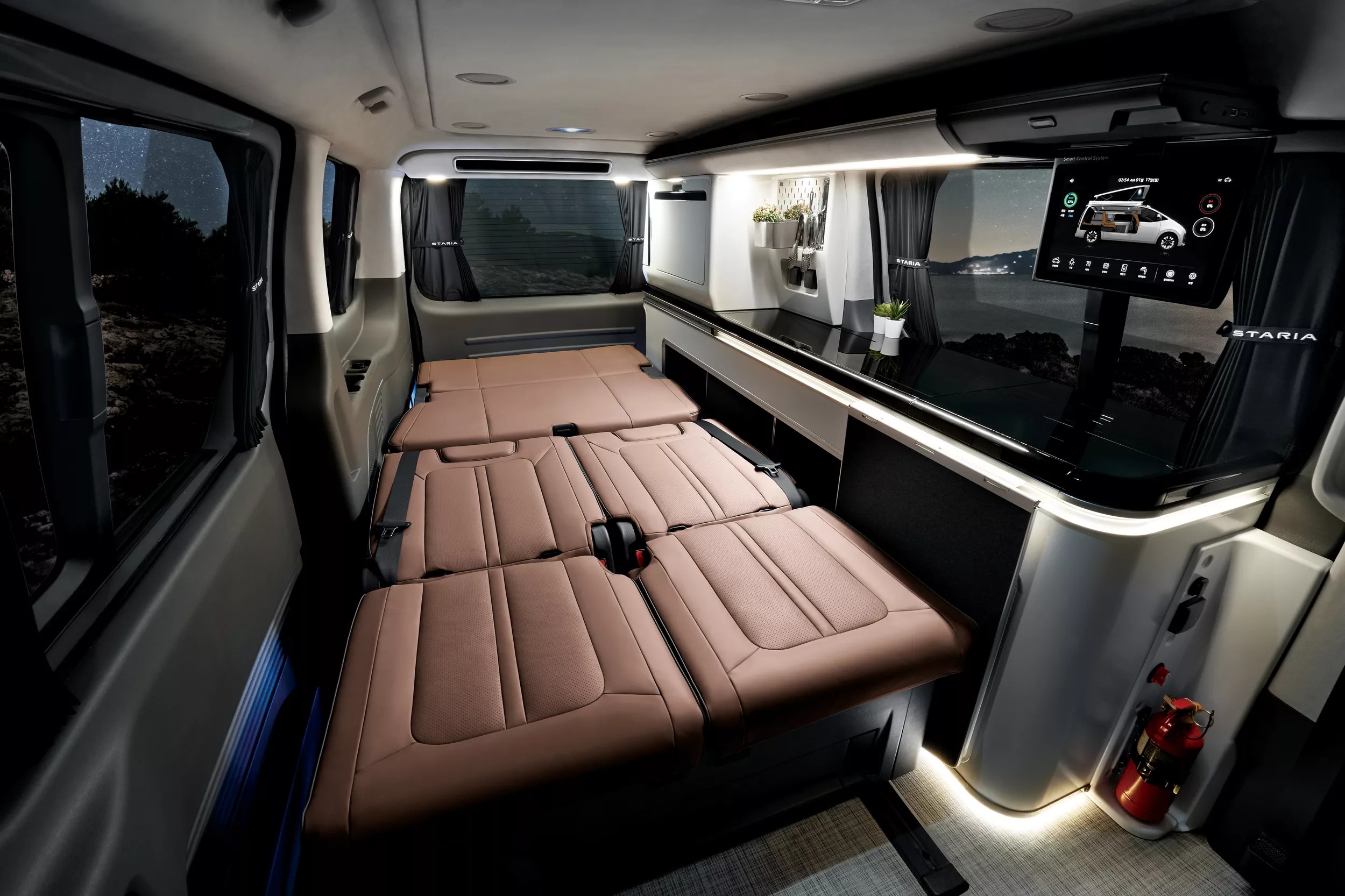 內部空間規劃是Staria Camper吸引目光的另一大亮點。第二排與第三排座椅可完全折疊,形成人可以平躺的空間,讓兩名成人能夠在車內舒適睡眠。透過座椅的靈活配置以及與車頂升降機構的結合,Staria Camper一躍成為一款可移動的房子,不再只是單純的露營概念,而更接近為長途旅遊及野營族所設計的電動居家空間。