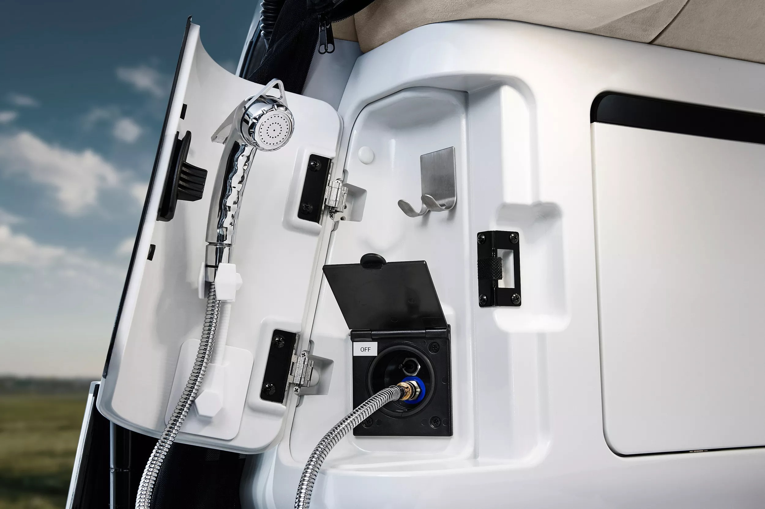 Staria Camper的後尾門更被Hyundai設計為一個多用途平台。後門打開時,可支援後方工作桌的拉出,也能使用內建的戶外淋浴設施,方便露營者在野外洗滌身體或清潔裝備,這類配置往往只見於改高級露營車。這樣的設計,遠勝一般透過後裝市場附加改裝件的方式,讓整車的露營功能更具整合性與可靠性。