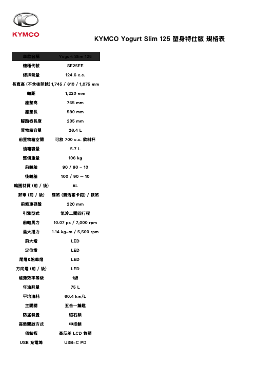 Yogurt Slim「優格塑身特仕版」 Slim意味更輕盈,車重再輕量化2 公斤,1級省油 (60.4 km/L)「優格塑身特仕版」前輪胎面寬度由 100mm 調整為 90mm,握把間距外展更省力、更好騎,特仕版升級搭載電子式輪速感測器,精準訊號低磨耗。Slim 美型車身線條整體輪廓更顯纖細,搭配輕奢「柏金風格設計」柏金飾樣提升質感、鉑金大燈飾框、柏金車身名牌、柏金前飾板、柏金後扶手。Slim 塑身特仕版前土除挑高拉伸比例、輕量芒星鋁合金輪框,排氣管防燙蓋都簡約有型。Yogurt Slim 125「優格塑身特仕版」提供珍珠黃、平光黑、粼光白、天幻藍四款配色,滿足不同風格需求。(車款詳細介紹請洽 KYMCO 光陽官網:www.kymco.com.tw)