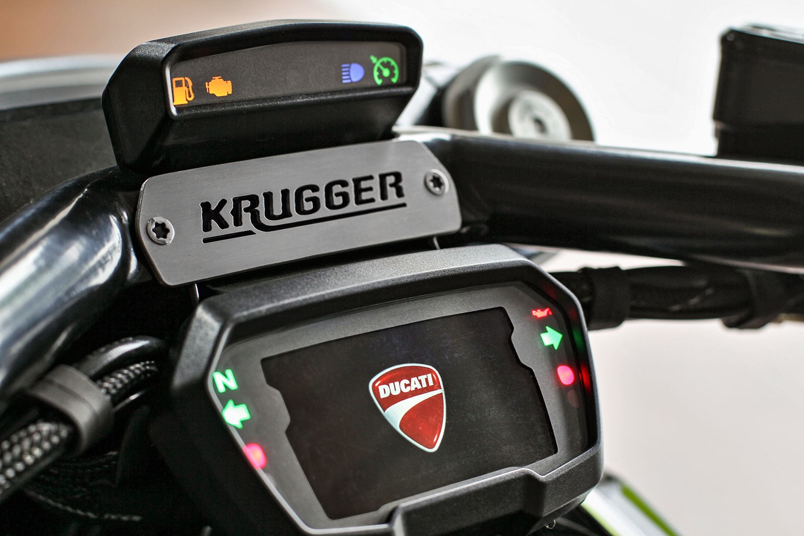 改裝者選擇將DUCATI 的最大特色之一編織鋼管車架掩飾起來,讓視覺焦點集中在那具1,262 c.c. 的碩大L雙缸引擎上,隱喻著巡航車一貫訴求的豪邁大器。