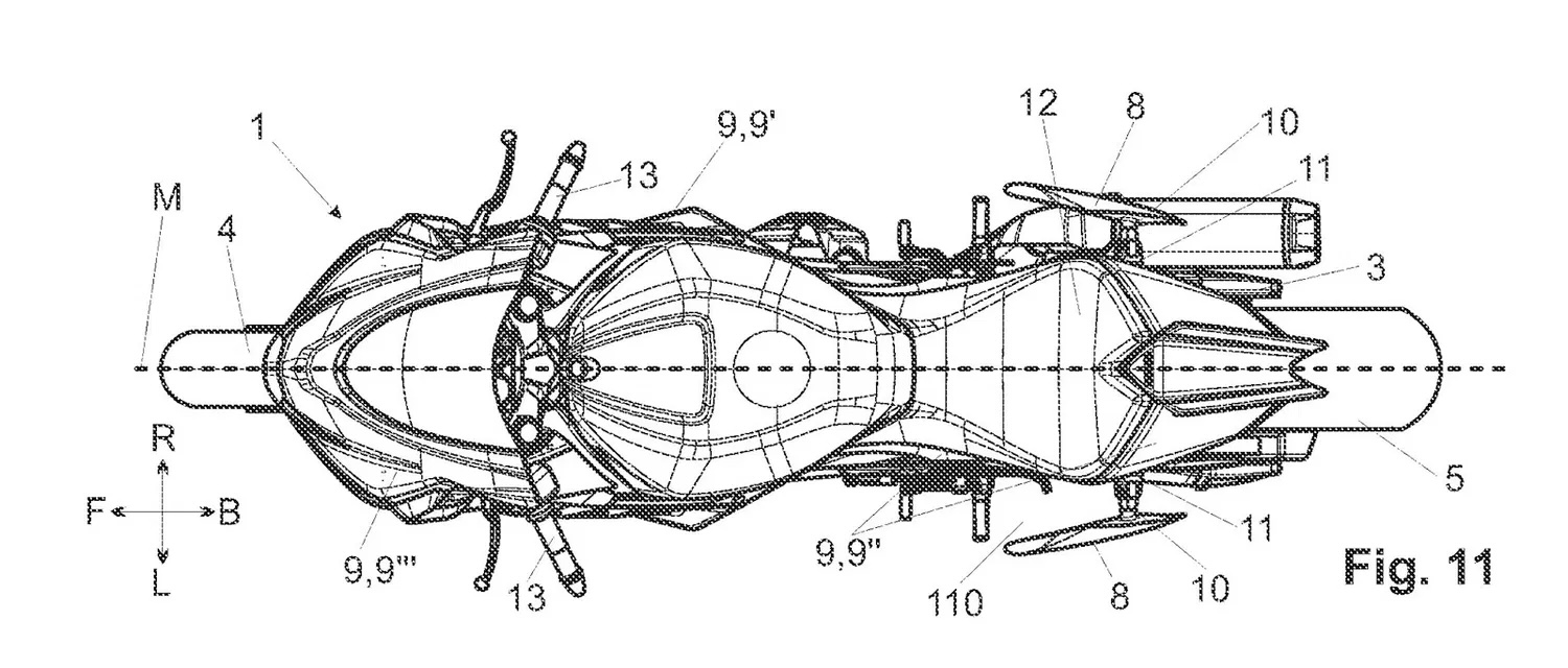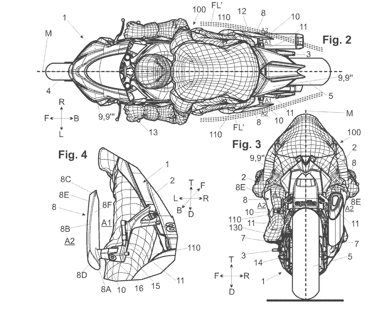 根據 Piaggio 集團最新曝光的專利圖,這套系統安裝在車尾兩側(大約是後座腳踏的位置),外型像是兩片垂直的整流板(編號8)。這項設計其實在近幾年的 MotoGP 賽場上已經見過雛形,但這次顯然是為了市售車(或市售賽車)而來。