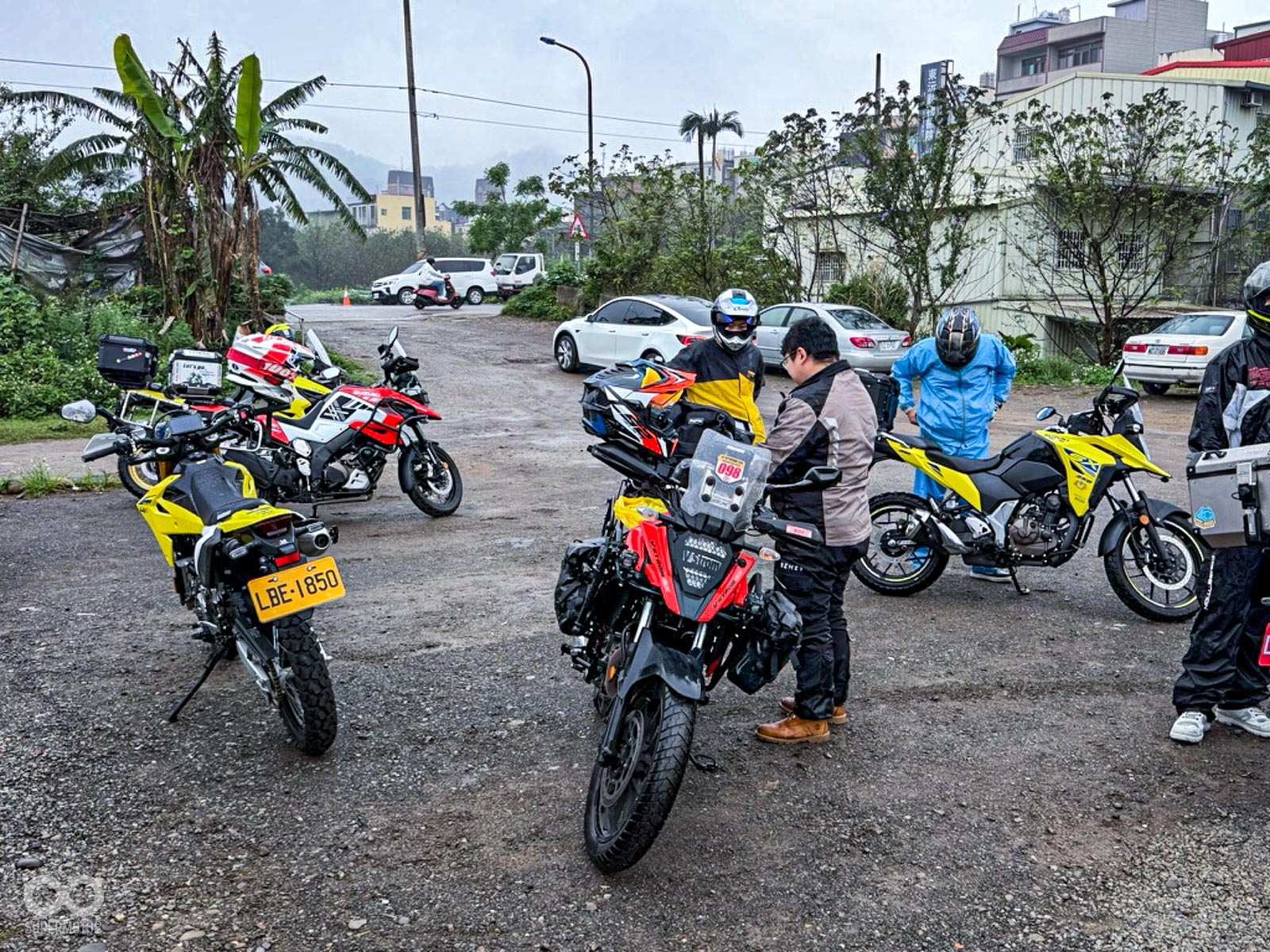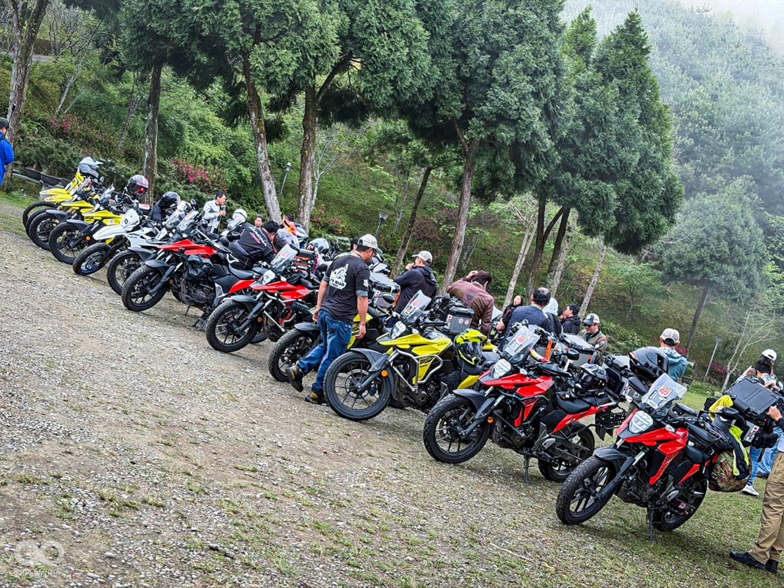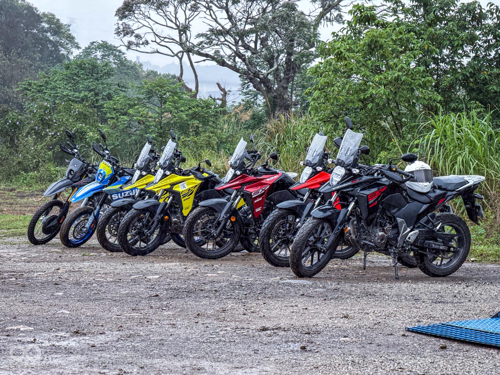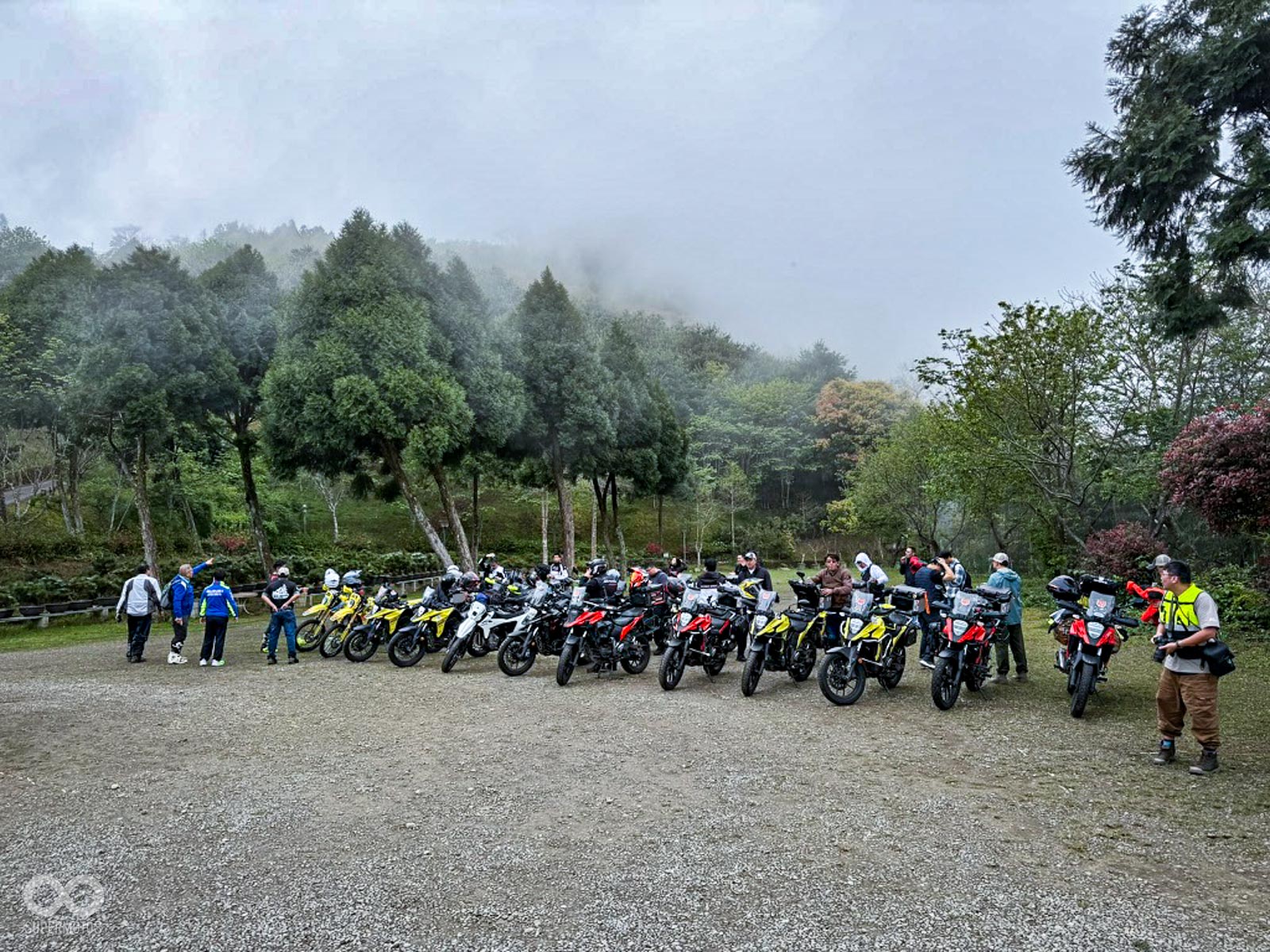 活動當天清晨 8 點,新竹關西的東安古橋被濃重的陰氣與細雨籠罩,空氣中瀰漫著泥土與汽油混合的氣息,一台台由 DR-Z4S、DR-Z4SM 以及 V-STROM 全系列組成的隊伍,在雨水中閃爍著冷冽的金屬光澤,緩緩在停車場內集結,天空降下的毛毛細雨絲毫沒有減緩車友們的熱情。