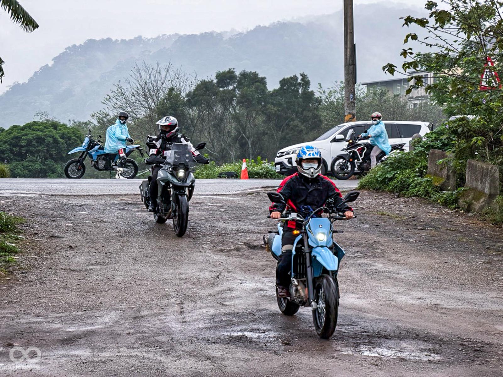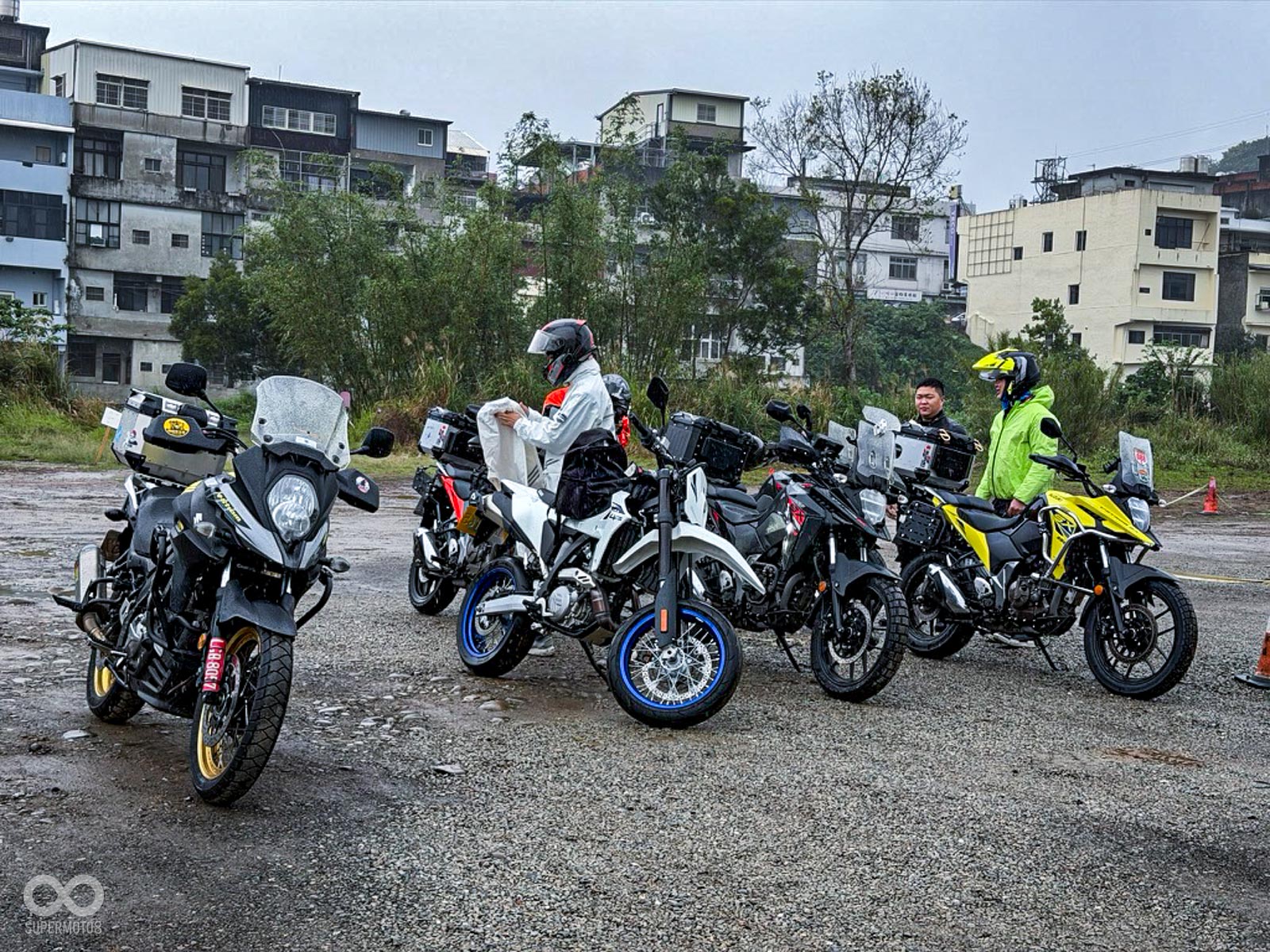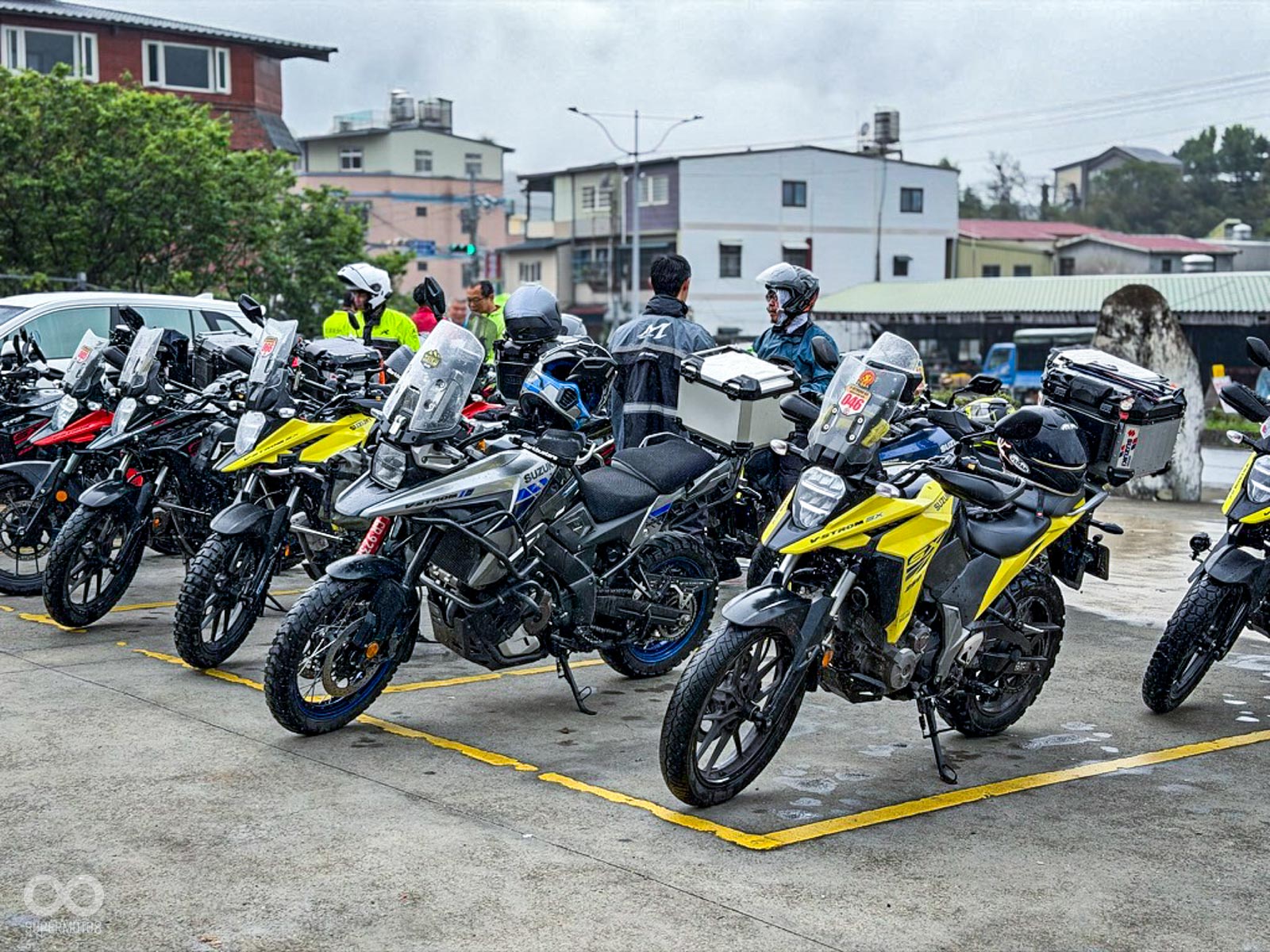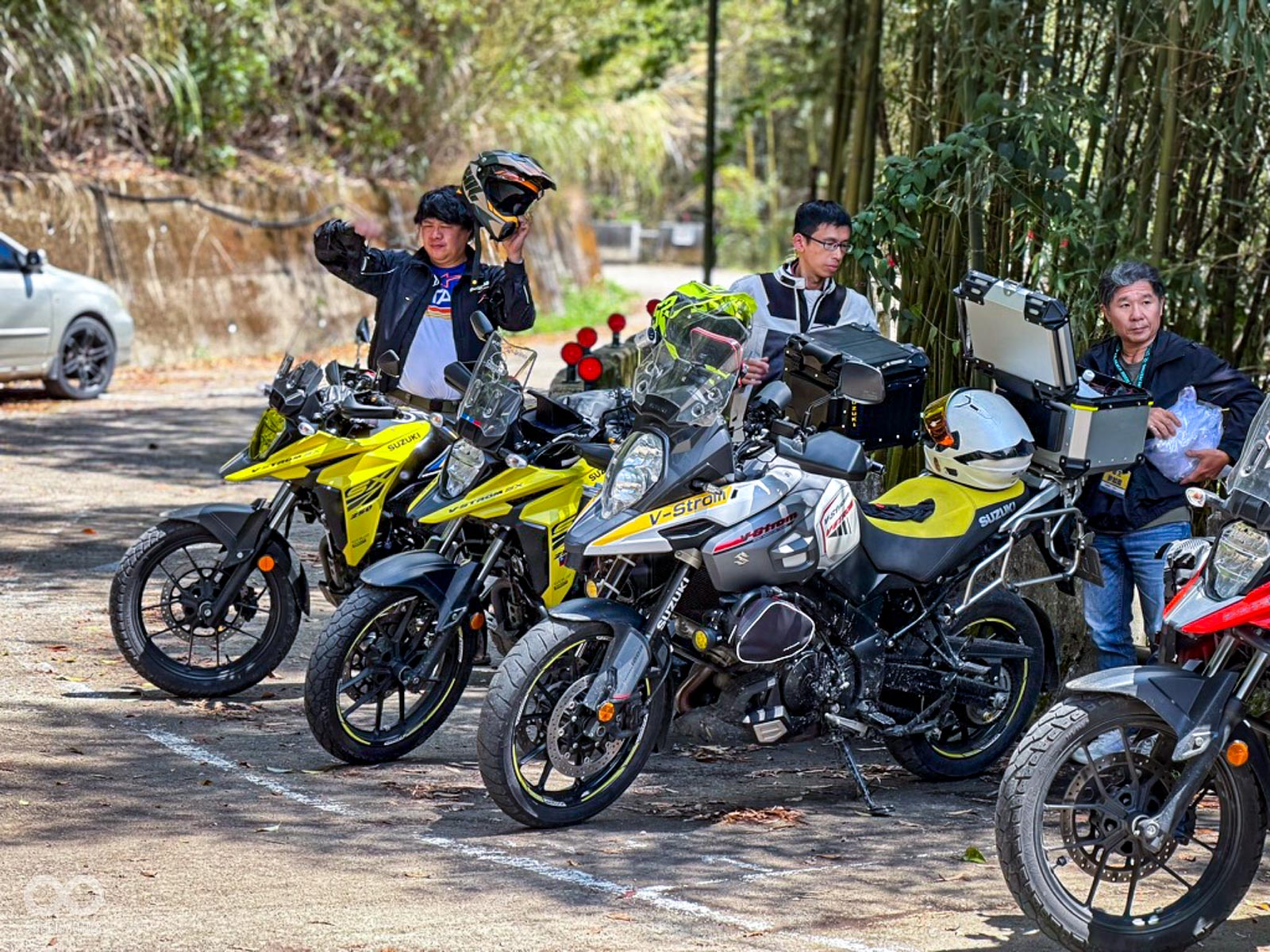 活動當天清晨 8 點,新竹關西的東安古橋被濃重的陰氣與細雨籠罩,空氣中瀰漫著泥土與汽油混合的氣息,一台台由 DR-Z4S、DR-Z4SM 以及 V-STROM 全系列組成的隊伍,在雨水中閃爍著冷冽的金屬光澤,緩緩在停車場內集結,天空降下的毛毛細雨絲毫沒有減緩車友們的熱情。