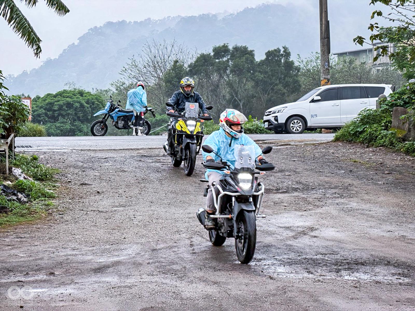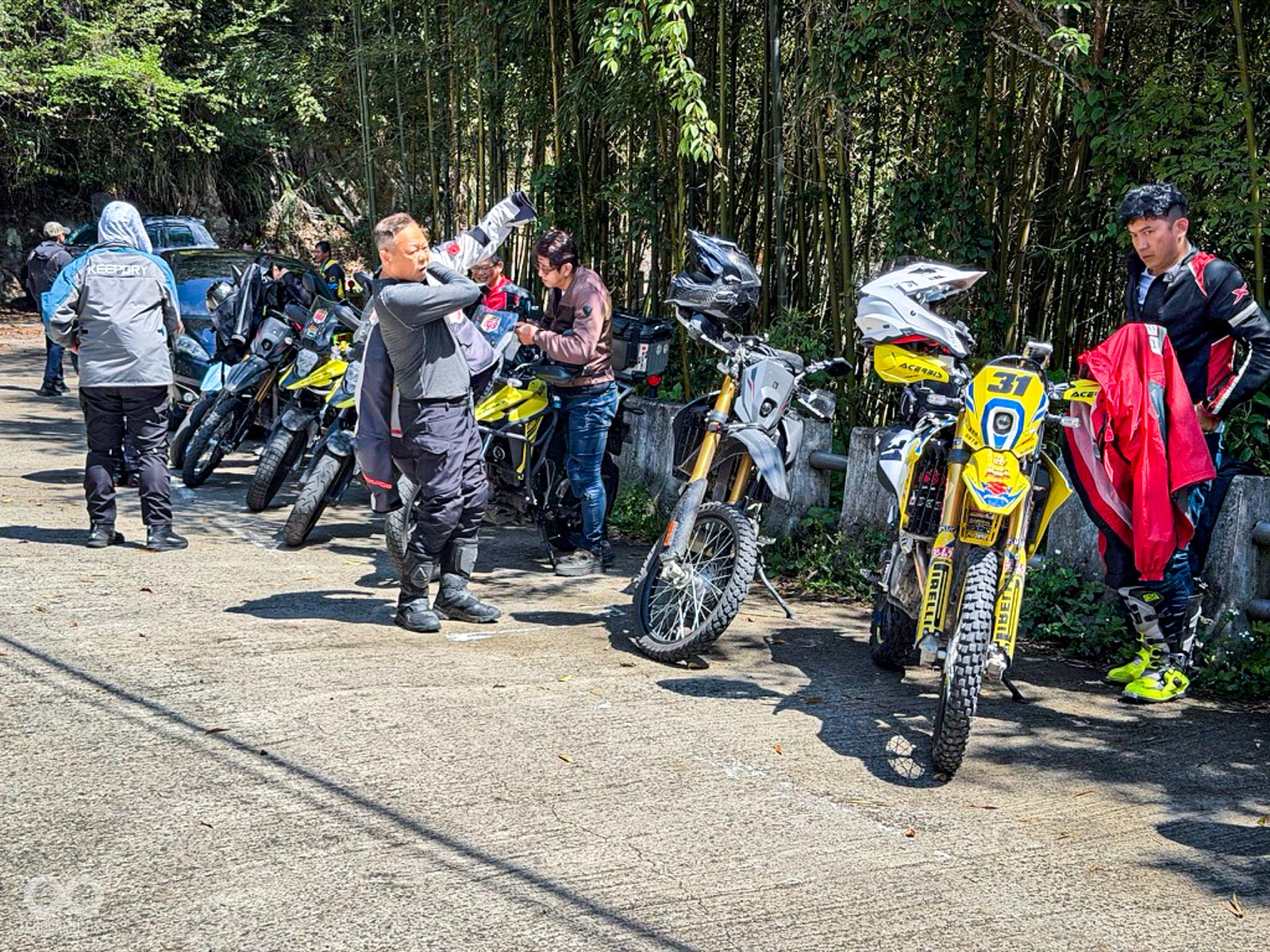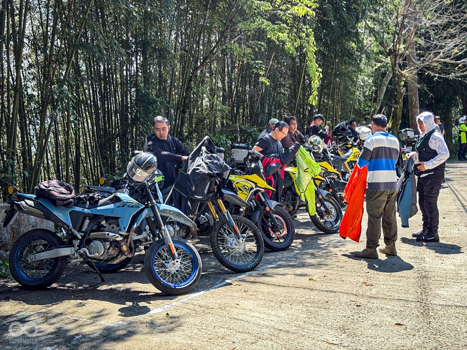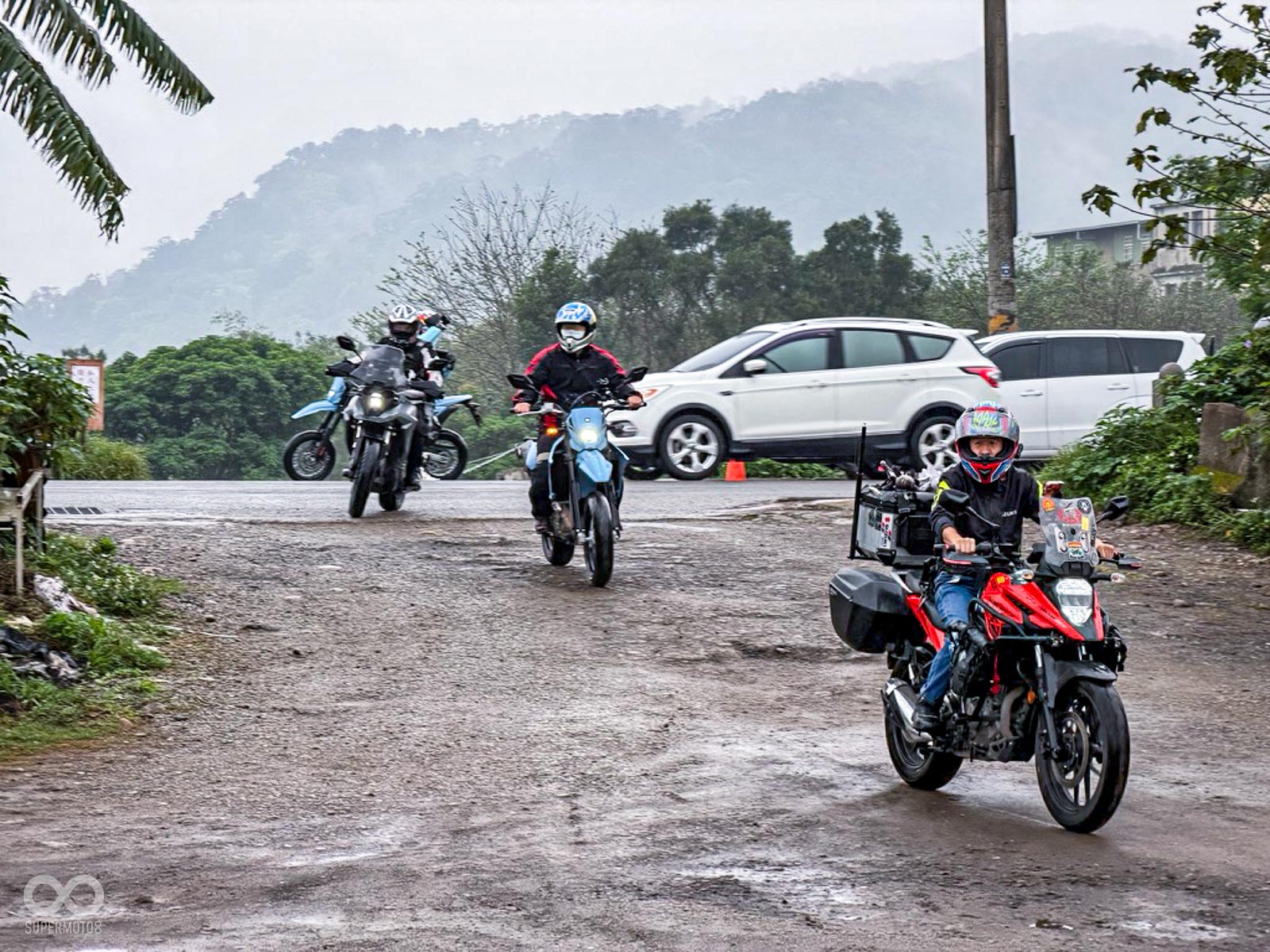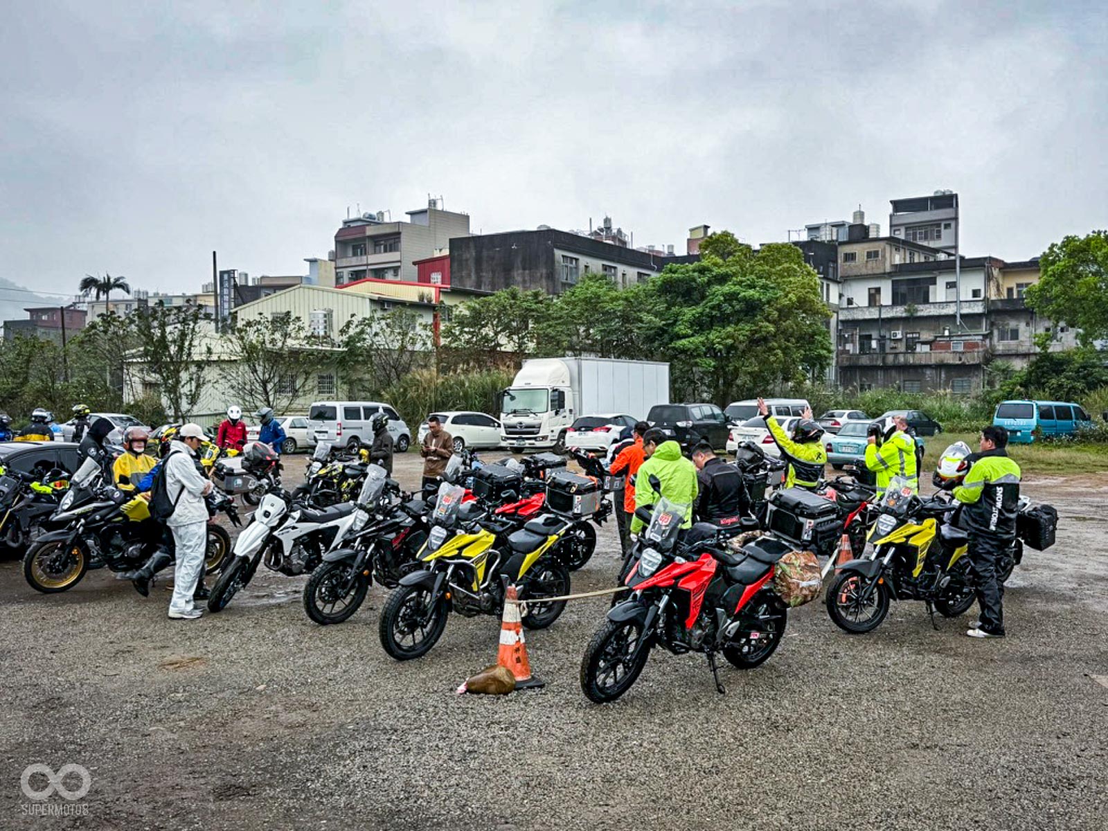 活動當天清晨 8 點,新竹關西的東安古橋被濃重的陰氣與細雨籠罩,空氣中瀰漫著泥土與汽油混合的氣息,一台台由 DR-Z4S、DR-Z4SM 以及 V-STROM 全系列組成的隊伍,在雨水中閃爍著冷冽的金屬光澤,緩緩在停車場內集結,天空降下的毛毛細雨絲毫沒有減緩車友們的熱情。