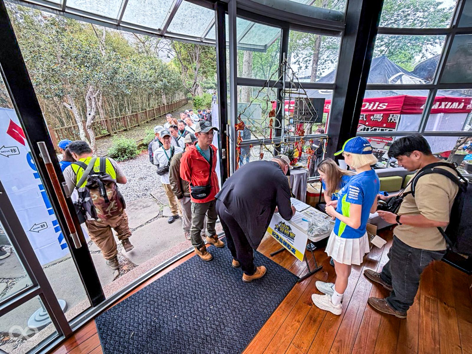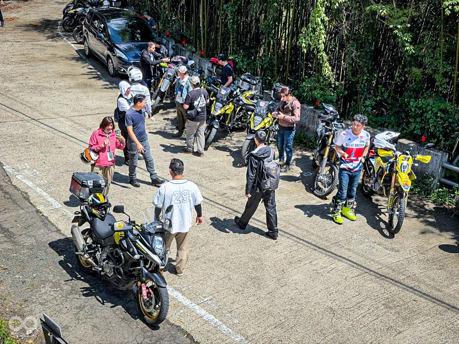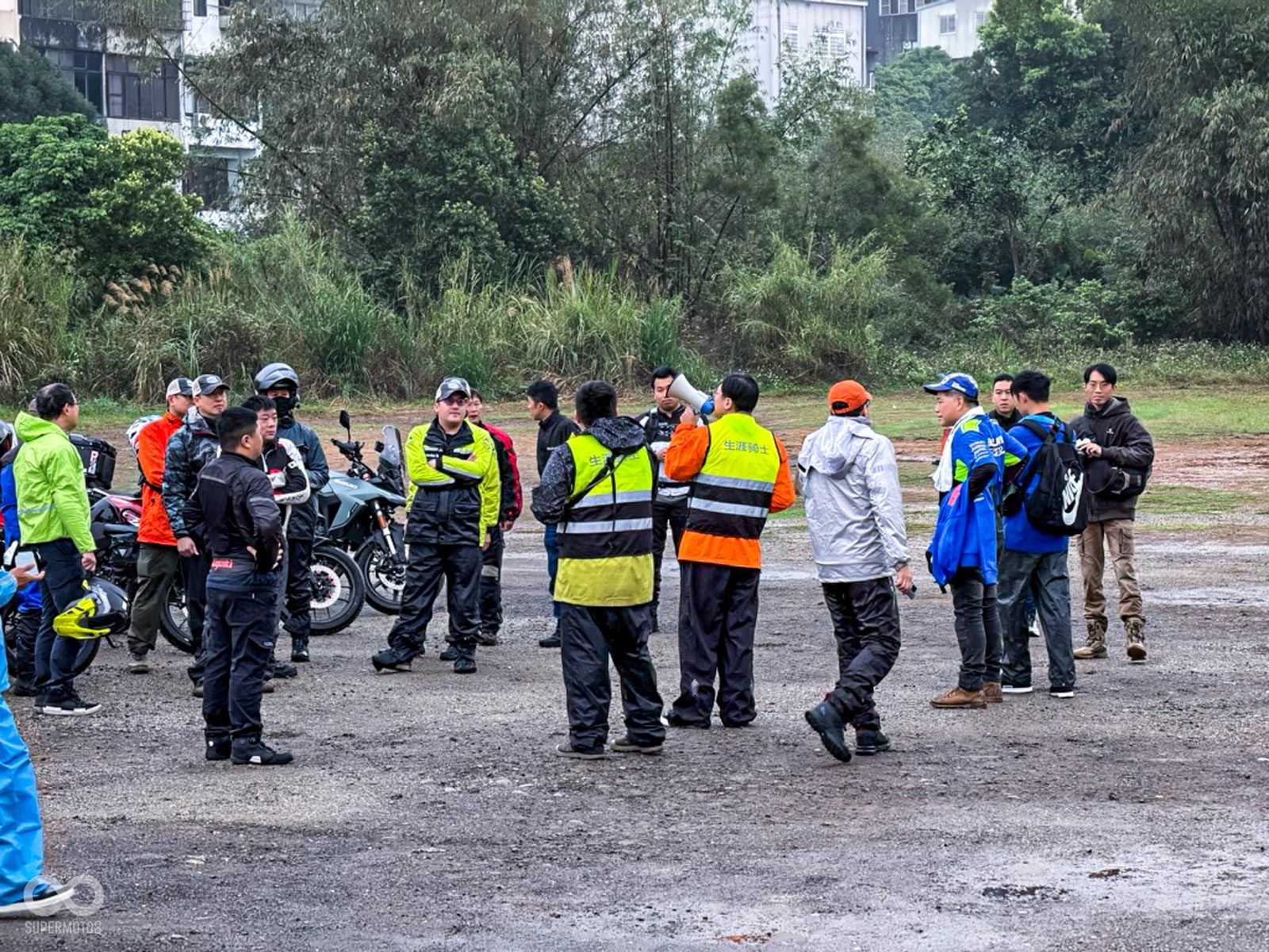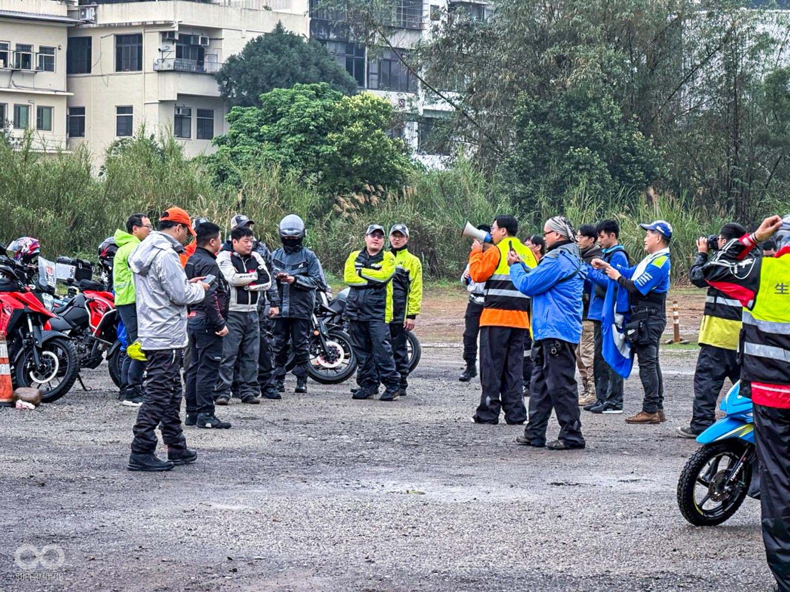 活動當天清晨 8 點,新竹關西的東安古橋被濃重的陰氣與細雨籠罩,空氣中瀰漫著泥土與汽油混合的氣息,一台台由 DR-Z4S、DR-Z4SM 以及 V-STROM 全系列組成的隊伍,在雨水中閃爍著冷冽的金屬光澤,緩緩在停車場內集結,天空降下的毛毛細雨絲毫沒有減緩車友們的熱情。