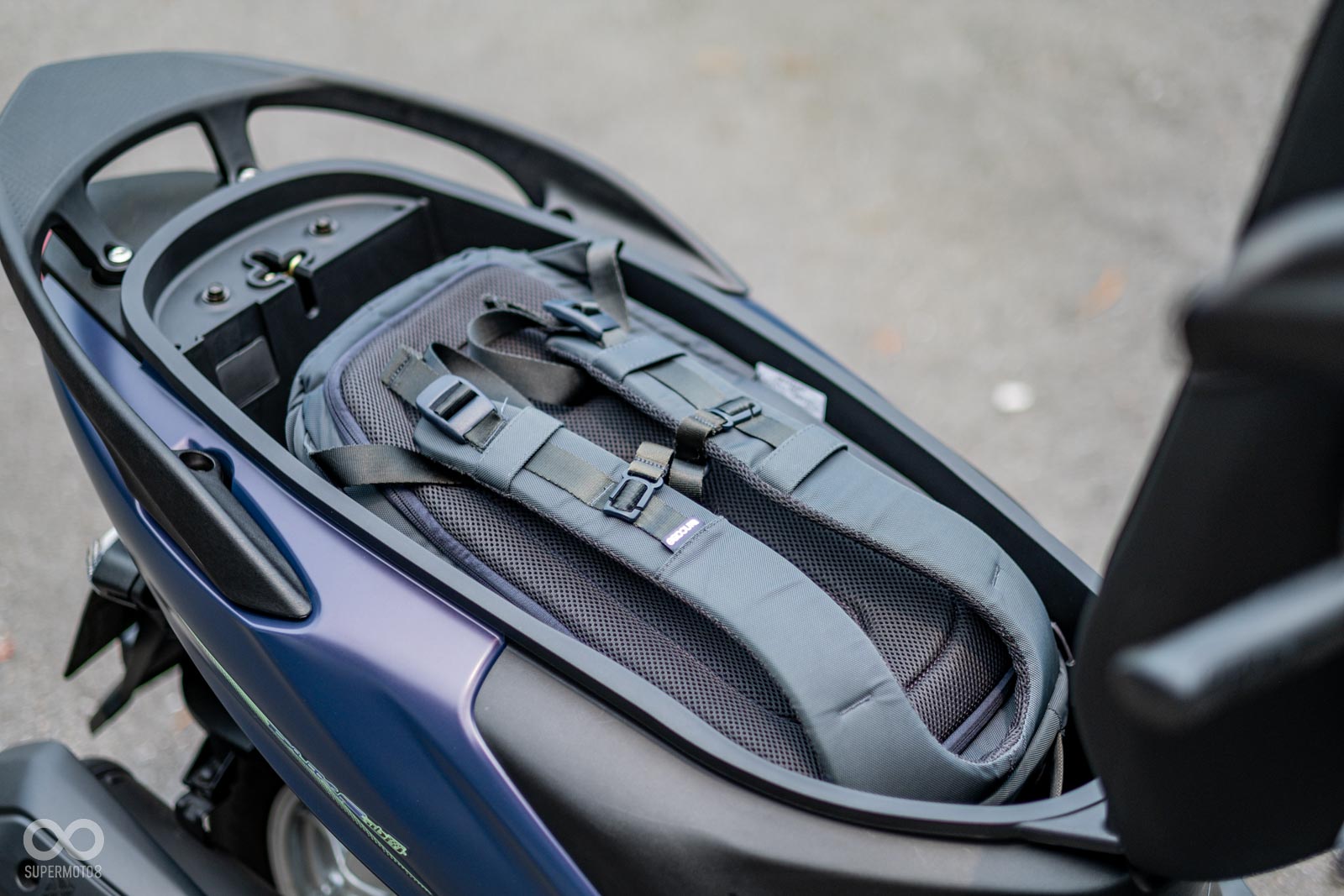 掀開那張長達 689mm、座高僅 755mm 的平整式坐墊,下方是容量高達 37.5 公升的置物空間,原廠強調其寬且深的幾何設計,要吞下兩頂 3/4 安全帽外加一套雨衣也毫不費力;拍攝時我們也直接把超大的攝影後背包直接放入測試,完全可以輕鬆收納毫不費力,筆者自家也有一台舊款的瘦迪,車廂的加深確實非常有感!