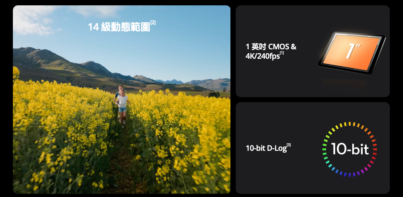 影像規格大躍進:維持 1 吋 CMOS 感光元件,但支援 4K/240fps 超高格率,慢動作細節翻倍。