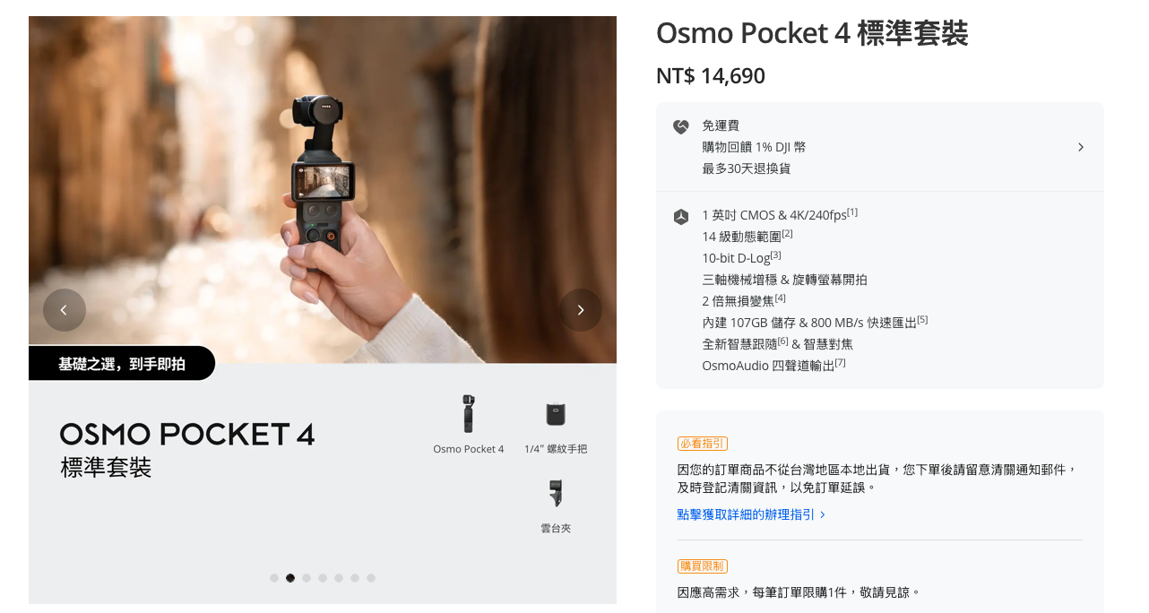 目前 DJI Osmo Pocket 4 標準套裝已經正式在官網上架,台灣售價為 NT$ 14,690 元。套裝內包含主機、1/4" 螺紋手把以及雲台夾,滿足基本拍攝所需,不過要提醒大家,由於目前需求熱烈,每筆訂單限購 1 件,想入手的朋友手腳可要快了。