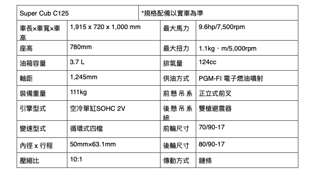 動力方面,Super Cub C125 採用 124c.c. 空冷單缸引擎,搭配 PGM-FI 電子燃油噴射系統與離心式離合器設計,提供直覺且輕鬆的操控體驗,車體則採用鋼管車架、前後懸吊系統與17吋輪圈配置,確保穩定可靠的騎乘感受,直立的騎乘姿勢帶來出色的全方位視野,座椅則提供優異的乘坐舒適性,滿足現代騎士對日常移動的多元需求。