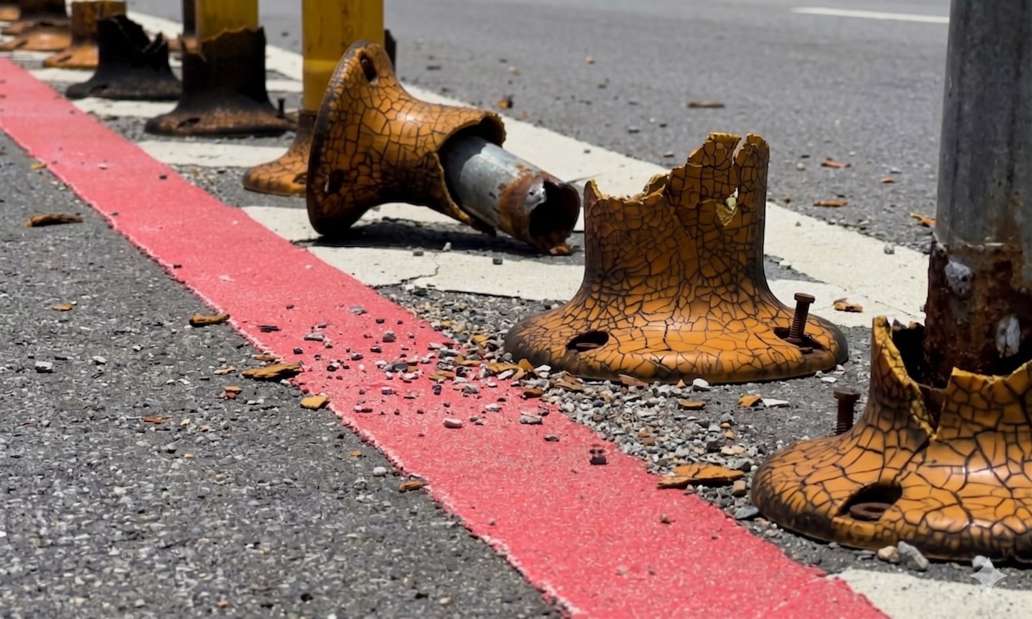 這些黃色防撞桿在台灣炎熱的氣候與大型車輛的蹂躪下,往往不出數月便會殘破不堪,屆時留在路面上的是斷裂的底座與鏽蝕的螺絲,對騎士而言,那簡直是隱藏的殺手。
