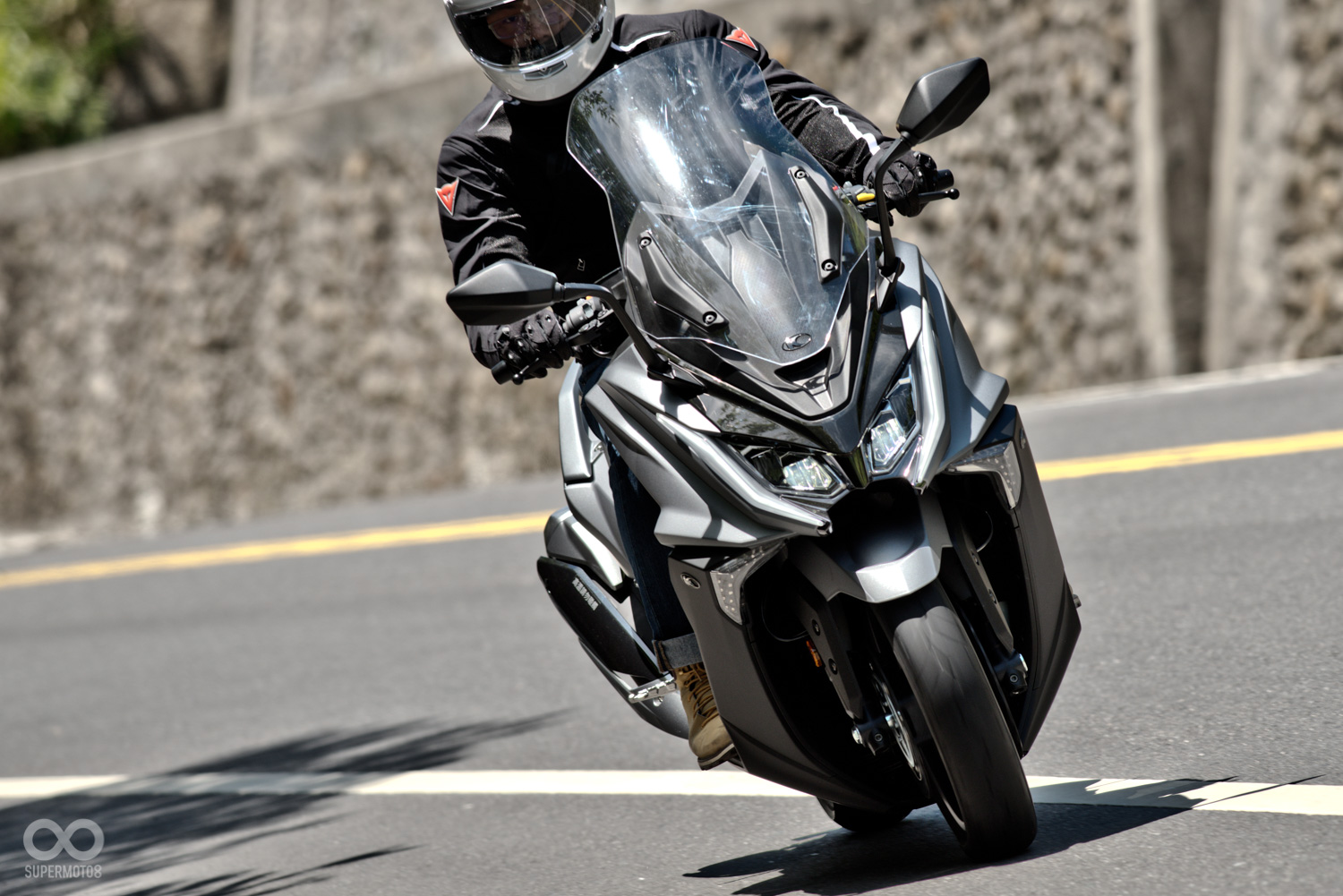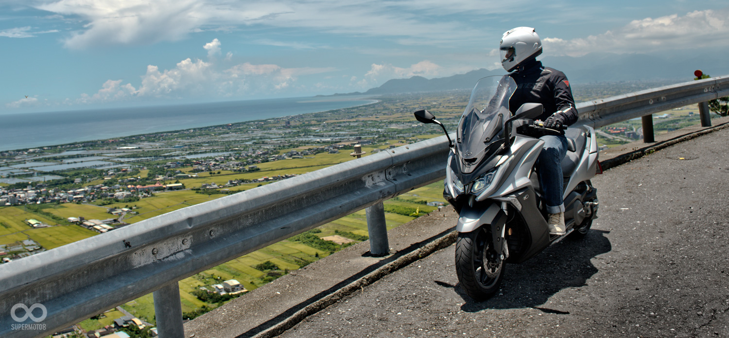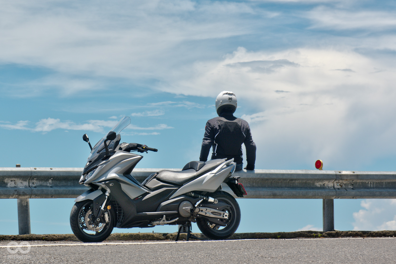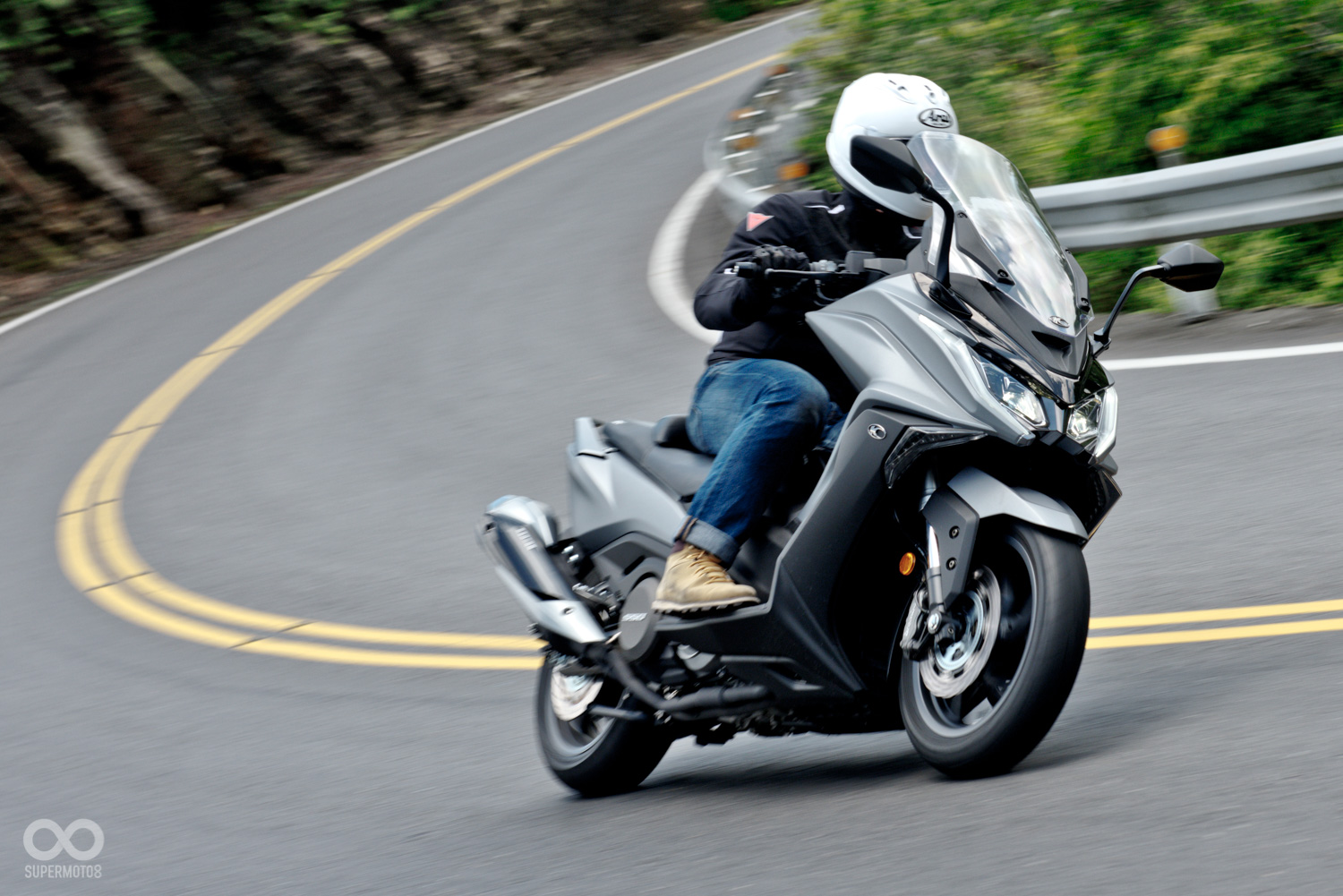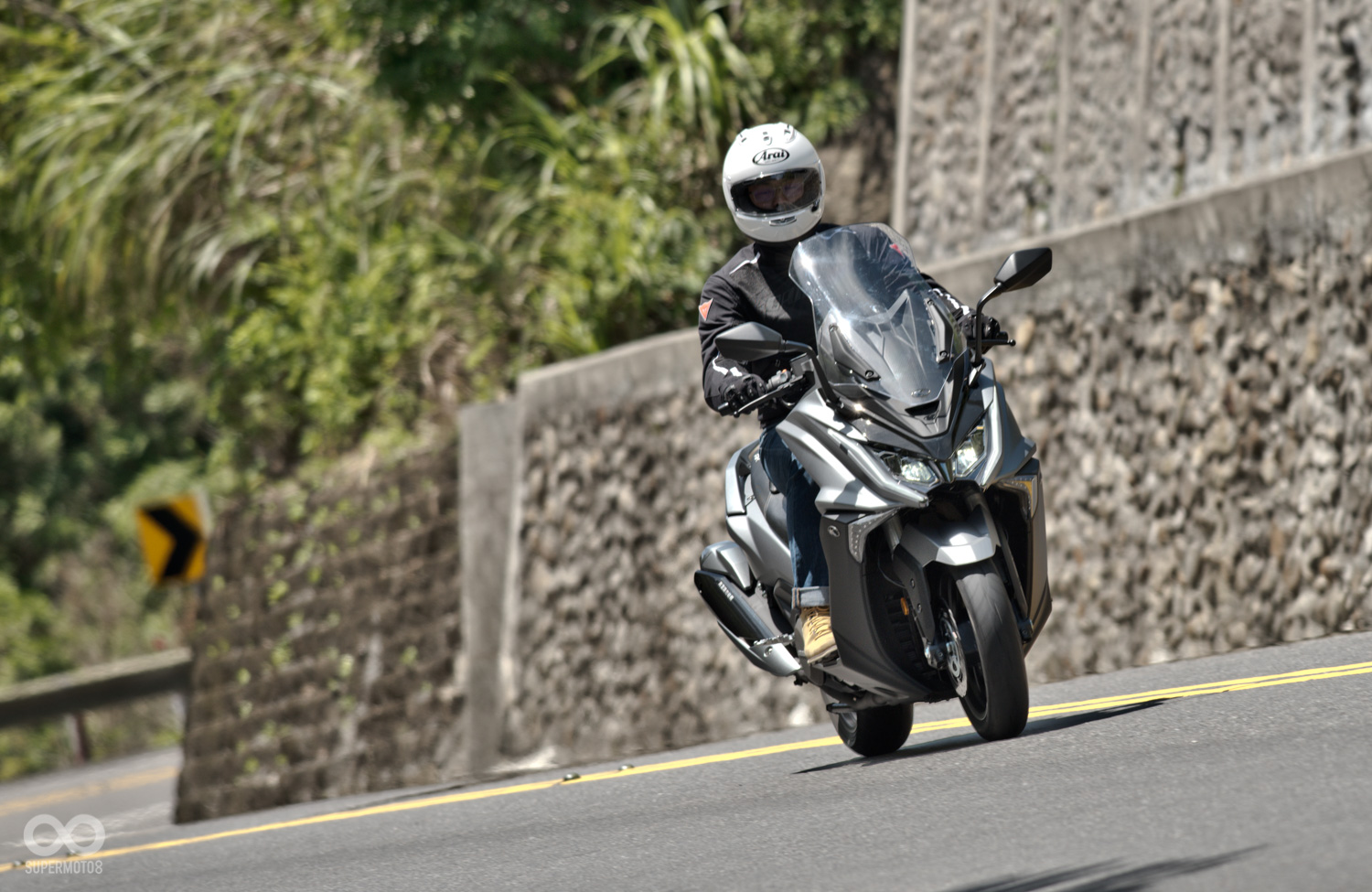 過境到宜蘭,路面逐漸開闊,大半徑的彎道也擁有更大的包容性,AK550略低的把手也正是為了這樣的高速操駕所設計,騎士背部自然微弓前傾,能有效的穩定自身核心並且擁有更直接的操控回饋,帶著比剛才高出一節的速度,把手一帶輕鬆倒入彎中,傾角之深完全不輸擋車,直到鞋側與粗糙路面摩擦,才驚覺極限已至。