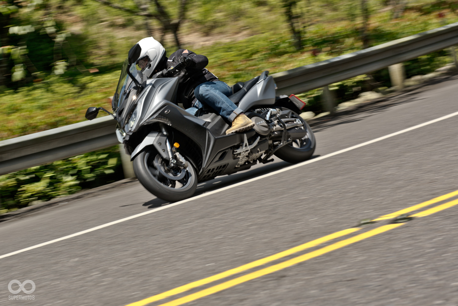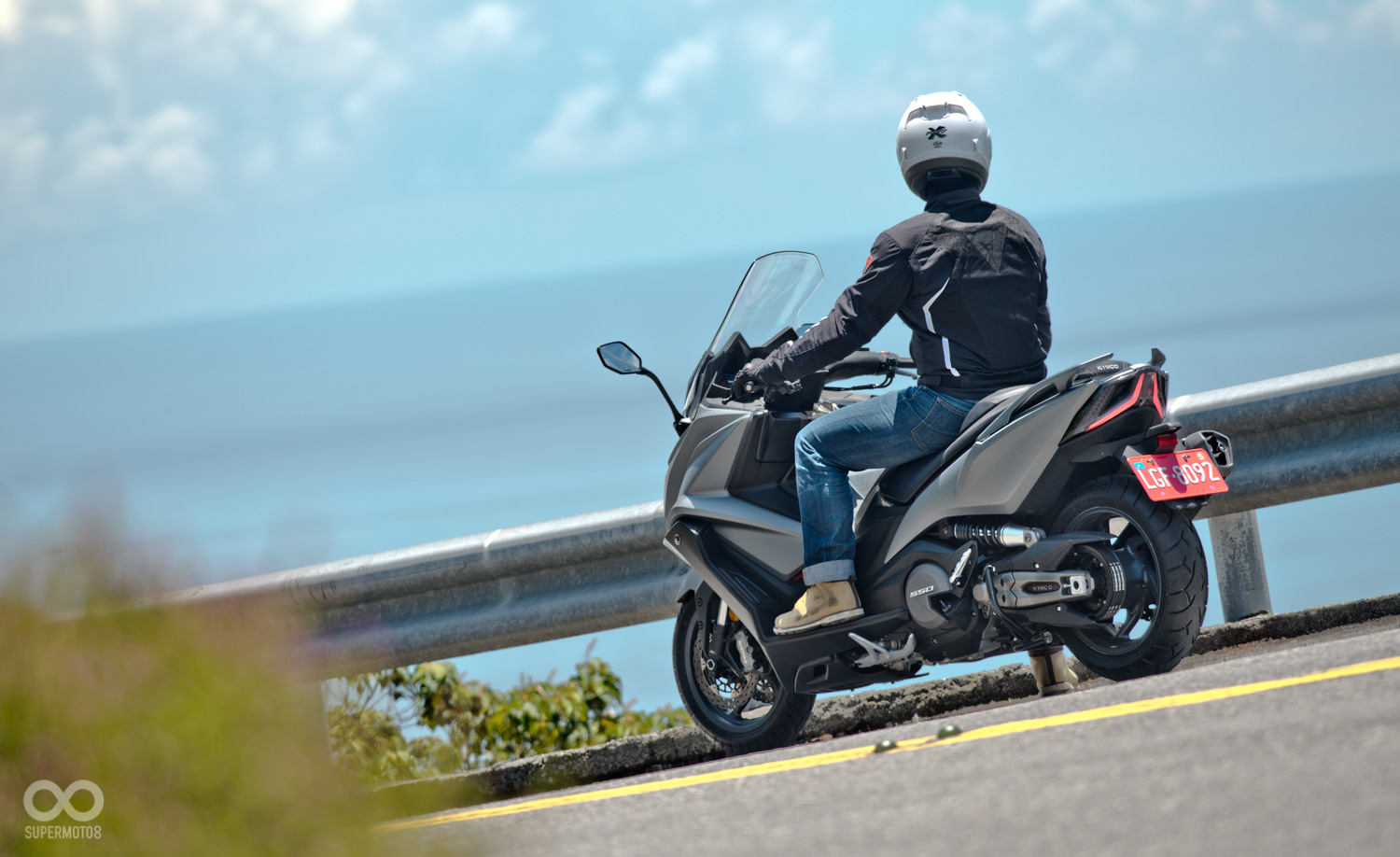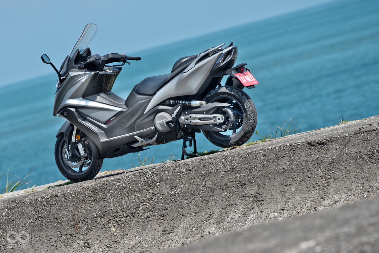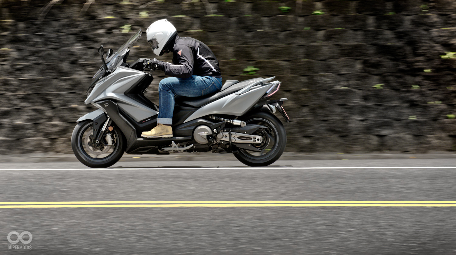 過境到宜蘭,路面逐漸開闊,大半徑的彎道也擁有更大的包容性,AK550略低的把手也正是為了這樣的高速操駕所設計,騎士背部自然微弓前傾,能有效的穩定自身核心並且擁有更直接的操控回饋,帶著比剛才高出一節的速度,把手一帶輕鬆倒入彎中,傾角之深完全不輸擋車,直到鞋側與粗糙路面摩擦,才驚覺極限已至。
