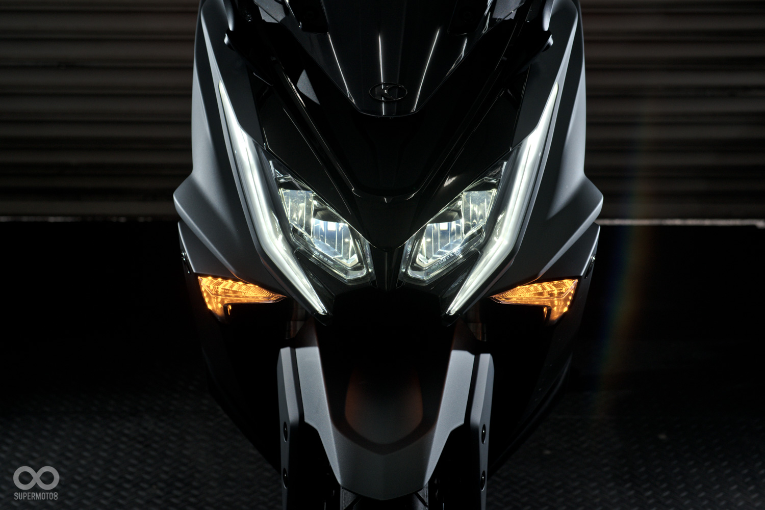 雖然在各種大小場合中與AK550見過不下百回,但獨自一人關在車庫內靜靜地凝視,這還是頭一回;看著燈光沿著車體流瀉,明暗之間剛猛有力線條雕塑出精實的肌肉,正面看去,兩側燈眉宛若兩柄匕首,冷冷地指向前端,搭配上中央的LED大燈,凝縮的造型勾勒出兇惡的倒三角切線,誇張銳利冷冽的戰鬥氣息,簡直像極了變形金剛裡的大反派Megatron,“殺”這樣另類的形容詞,在他身上卻相得益彰。