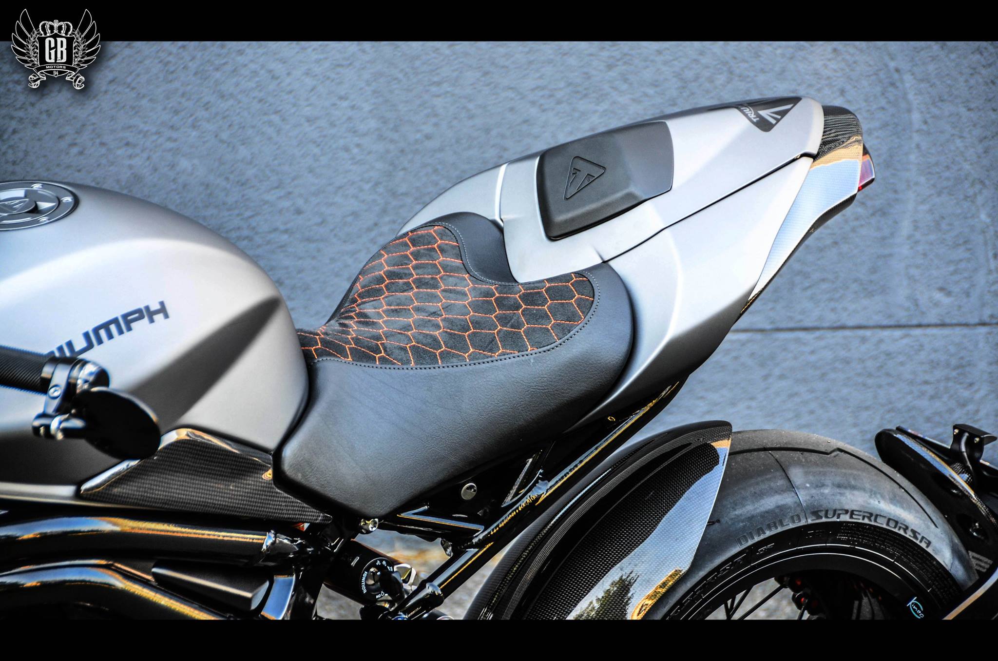 坐墊上得橘色六角型車縫線與剎車油杯顏色一致,與低彩度車身做對比,感覺得出是一輛經過細心改裝,但不乖張的英國性能街車。但就這樣停手似乎還有點單調,所以改裝者在車上的字樣裡稍微做了一點文章,也呼應車上大量的碳纖維改裝品。