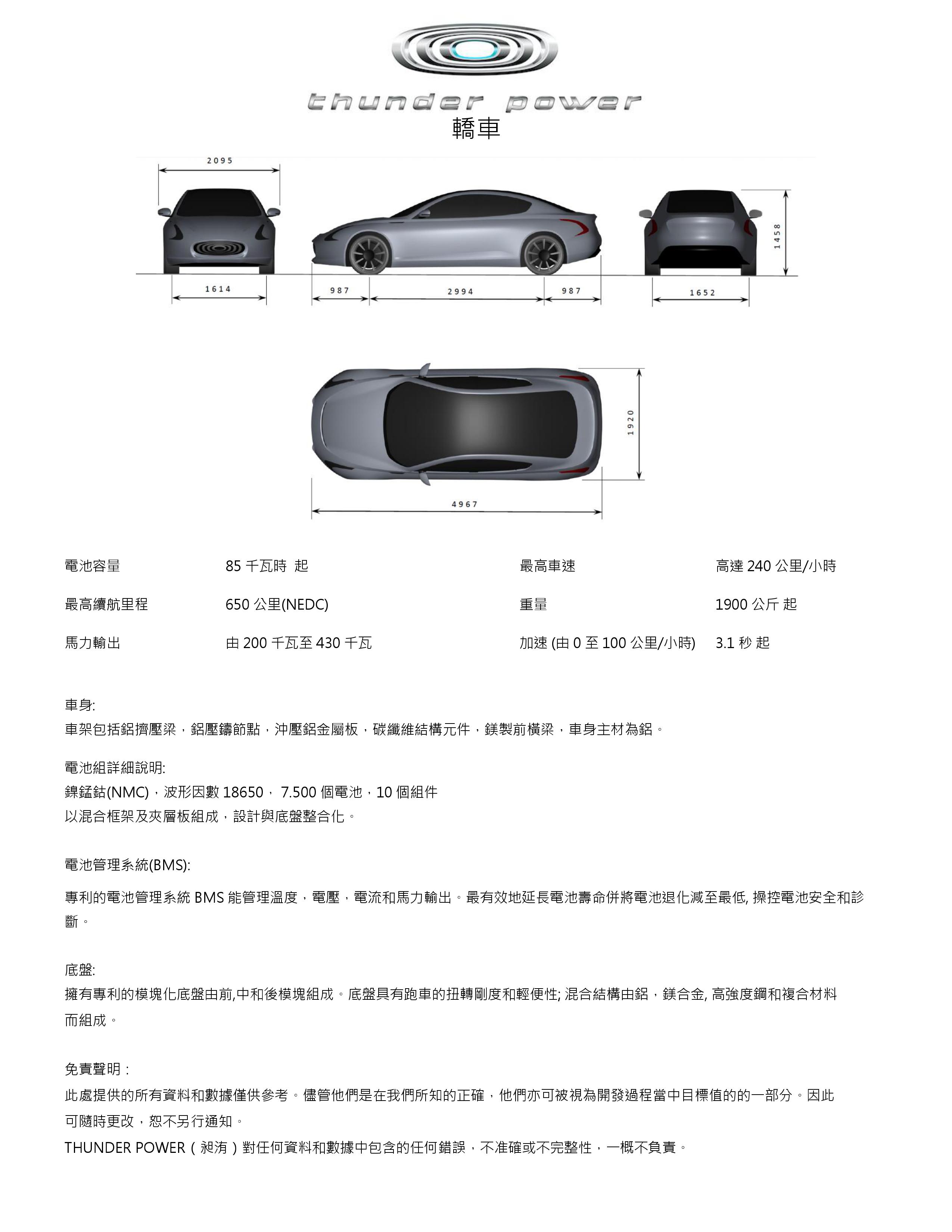 在動力系統方面,Thunder Power Sedan電動車結合歐洲風格設計以及先進的工程技術,擁有125kWh的電池容量,最高續航里程高達650公里。並提供多種動力選擇,最高430kW的馬達,提供駕駛者無可比擬的行車體驗,0-100km/h加速只要3.1秒。而Thunder Power迄今於美國及中國已擁有超過90項專利,另有250項專利正在申請中,其中包括革命性的模組化底盤設計。其模組化底盤系統將提供未來在不同領域的產品,能夠以更加快速、低成本的方式進行研發。