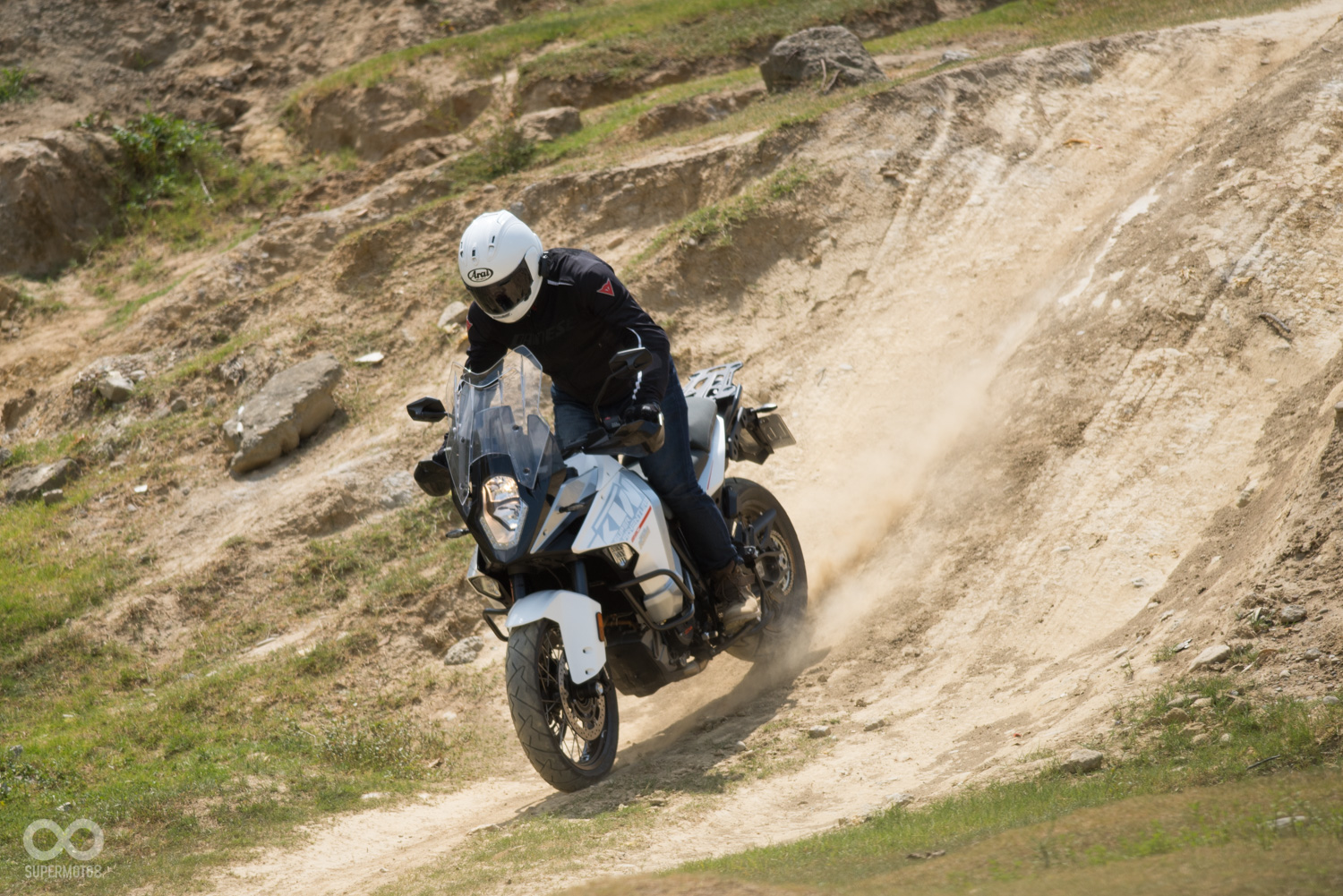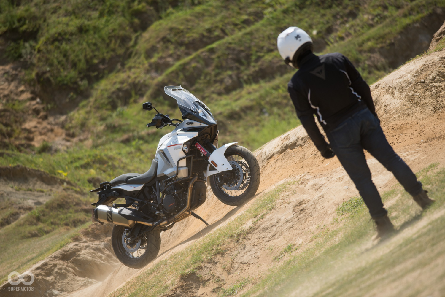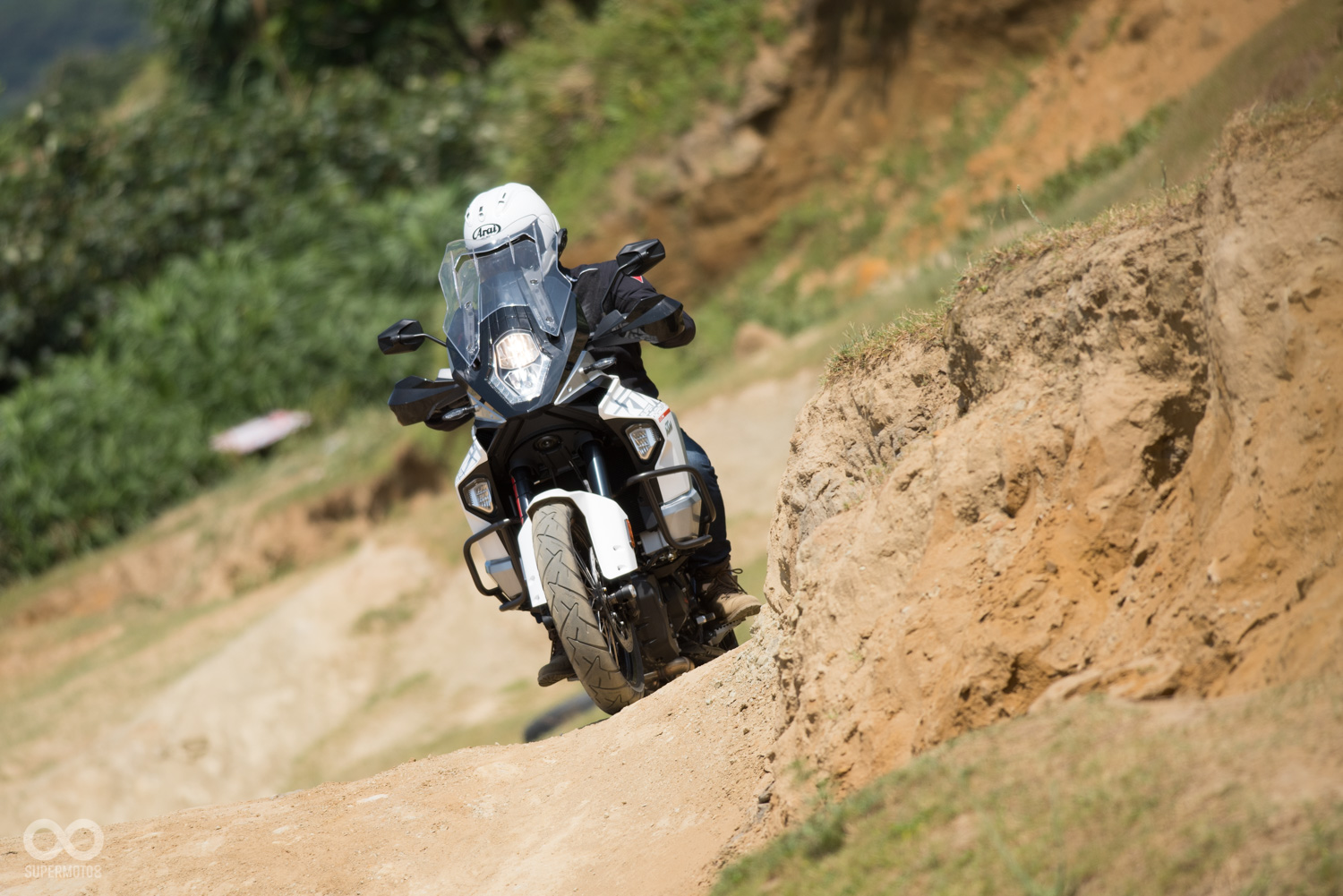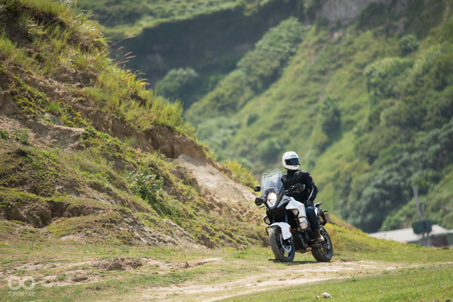 就在我逐漸掌握Super Adventure在土路上的動態時,攝影師出了道難題,指了指前方那近60度的陡坡,示意我衝上去,待了半響牙一咬補了油門,一鼓作氣的成功攻上土坡,但上去了之後才發現騎虎難下,土坡後頭沒路只能沿著原路折返,站在土坡邊上一陣天人交戰,抓緊了車把一躍而下,優異的懸吊吸收了大部分的衝擊,沒有多餘的偏擺安穩落地,雖說有些驚魂未定,但更多的是難以言喻的成就感。