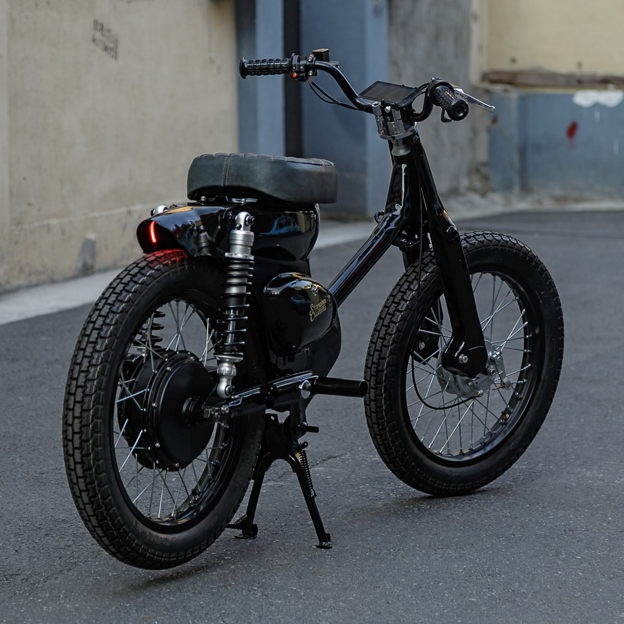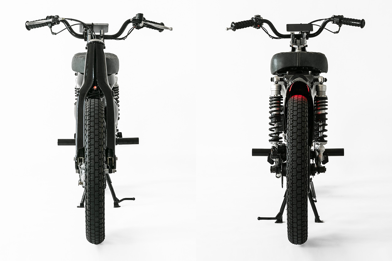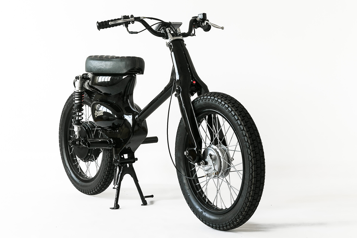 Matthew 將一輛傳統的Cub 全部拆光,將原來車架上安裝引擎的地方焊上一片鐵片,後搖臂也做了一點修改,以搭配後輪的輪轂式馬達。搖臂上的後座腳踏被留下來,因為他打算未來推出選配的雙座版。