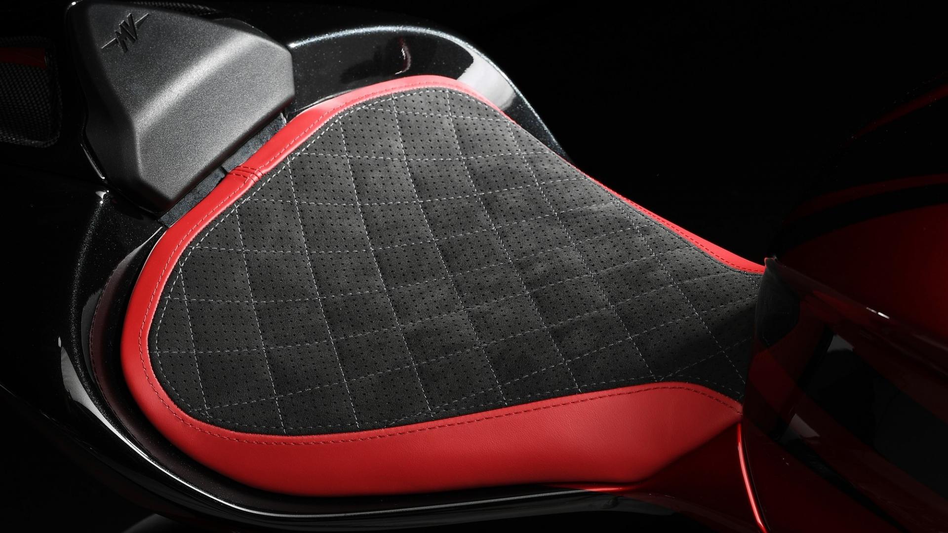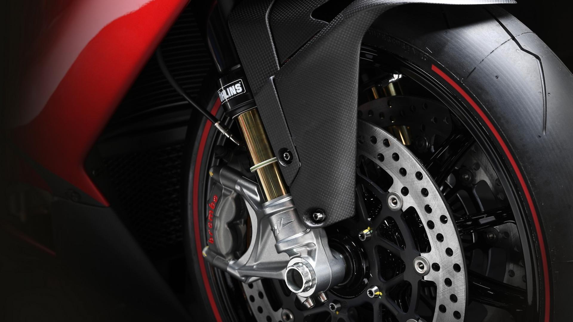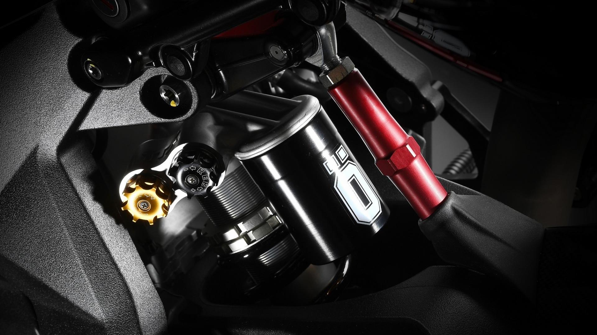 整流罩採暗紅色為底,搭配黑色與少許白色拉花,藏在裡面的全白色主車架是相當亮眼。坐墊改以豪華跑車的Alcantara 麂皮製成,OHLINS TTX36後避震器一改以往的招牌金黃色,選擇用低調黑氣瓶彈簧呈現。