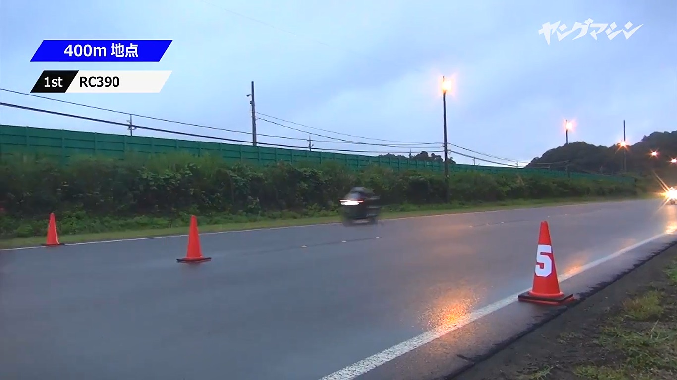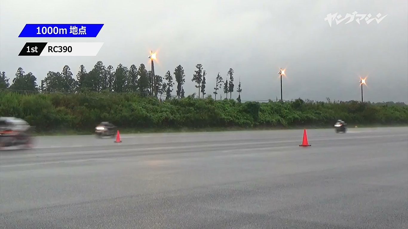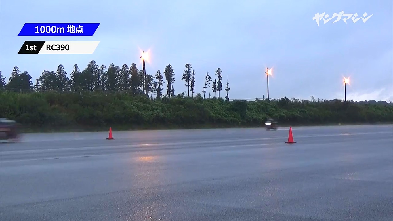 結果顯示,RC390 的尾速竟然都超越另外兩台雙缸跑車,三次1000m 記時點都拿下第一,非常不可思議。另外兩人表示,最初的起步跟中速感覺上並沒有特別突出的表現,但是過了一定程度的速度之後RC390開始爆發,當下真的是看著它噴出去一樣的被海放。