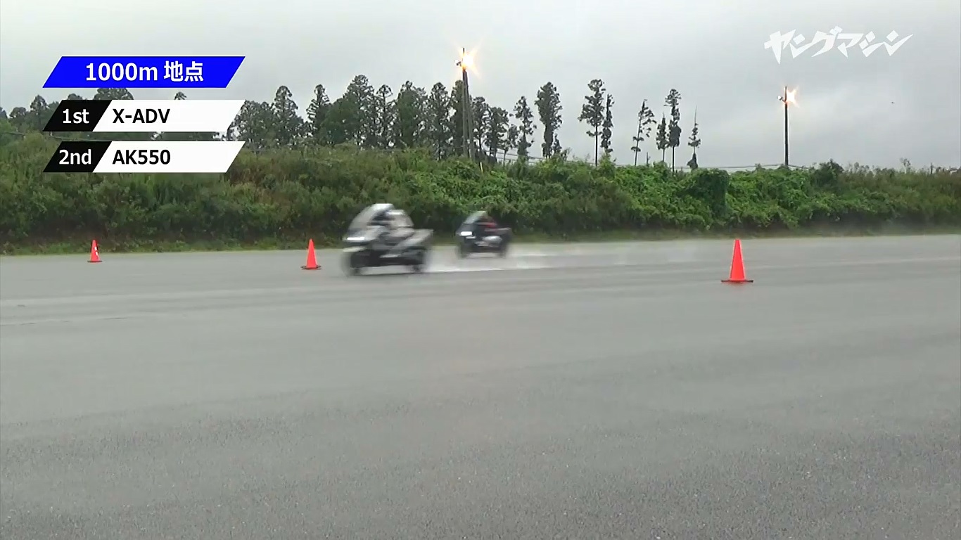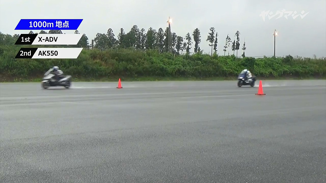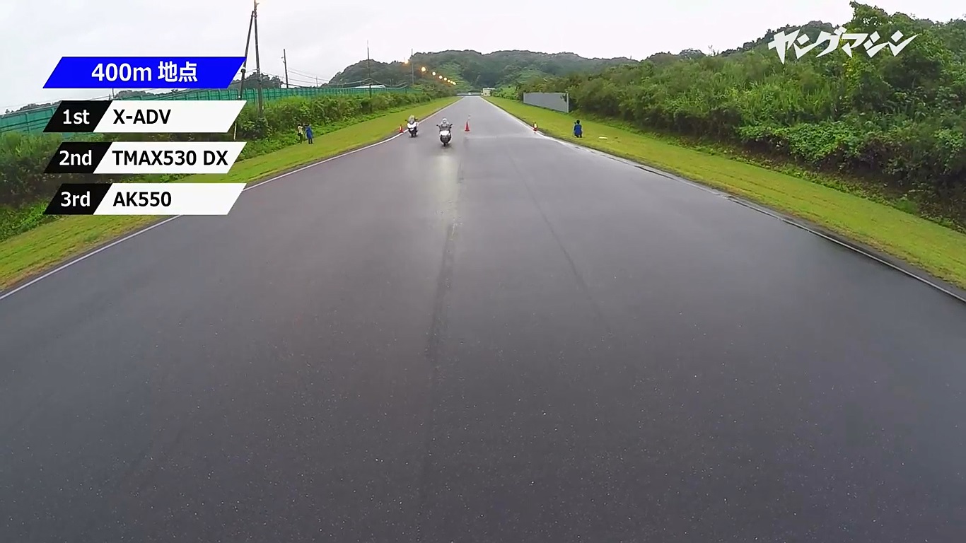 而各項機構都較為接近的AK550與T-MAX也讓試車手感覺到各自不同的優點:T-MAX 所得到的可能不是最速的感受但是卻是異常穩定的騎乘體驗。峰值馬力出現在7,500 rpm 的AK550則在第三輪的400m 扳回顏面取得第二,證明除了尾速以外,中段加速性能也是相當優異,同時本次的試車手也對於AK550的加速感以及性能大為滿意,除了加速延伸性上的表現之外,車體穩定度也是非常不錯。
