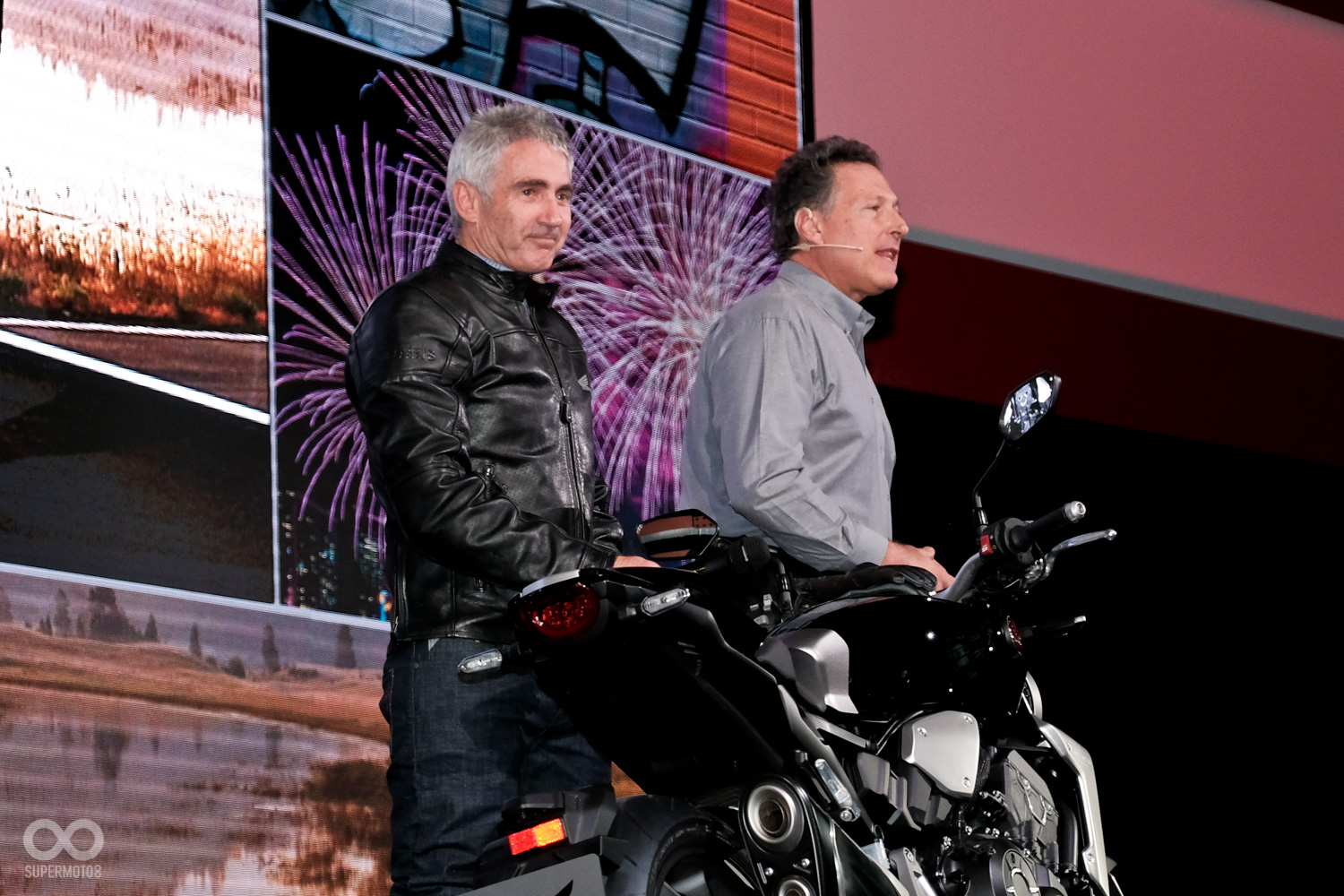 小老弟介紹完之後,大家期待已久新一代CB1000R終於登場,延續與先前Neo Sports Cafe'的風格,在大排氣量直列四缸的加持下,造型飽滿雄偉,此外還宣佈將會有更高規格的CB1000R+版本,高規格的配備、帥氣的外型但HONDA給的驚喜卻不止於此,騎士的帽子一摘居然是好久不見的傳奇車手Mick Doohan,而展前發表會也在驚奇與興喜的掌聲中歡樂落幕,至於HONDA還會帶給我們哪些驚奇,就讓我前進EICMA展場後,再為各位一一解密吧!
