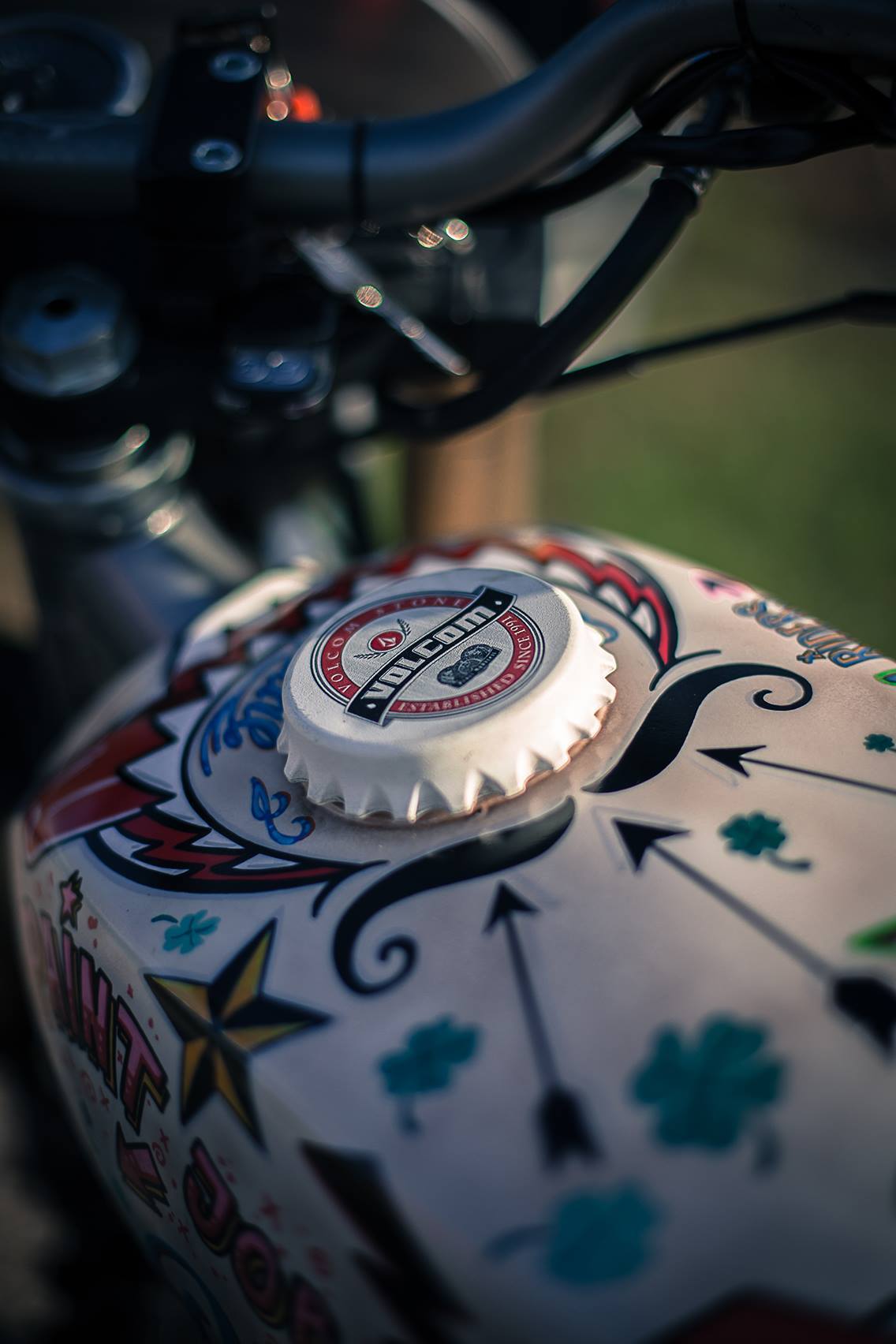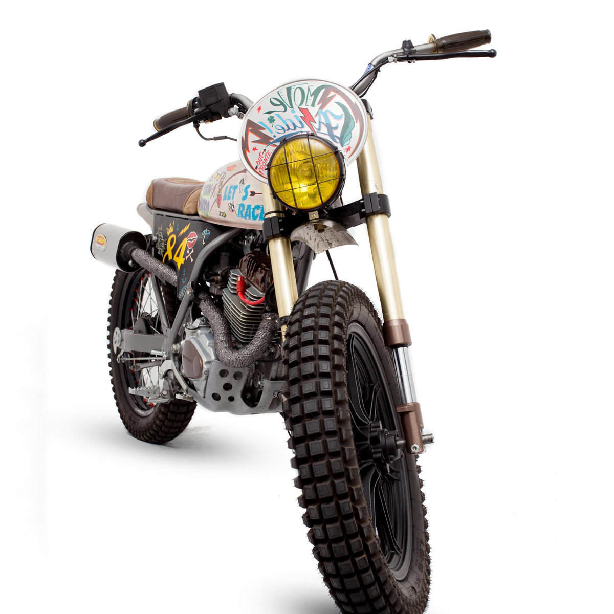 手工改裝廠Dream Wheels 幾年前開始著手改裝Honda CLR125 ,因為CLR125 成本低廉又有著可靠的引擎,非常適合穿梭在街頭,是一個非常好的改裝素材。而今天這台CITYFLY原本只是台pizza車 ,經過Dream Wheels巧手,換上 RMX50前叉、復古手把與開關、復古圓燈、LED尾燈、XS400 18吋前鋁框 後面搭配鋼絲框、油箱彩繪、等.... 最後再加上那個畫龍點睛的滑板架,街頭復古風一拜!